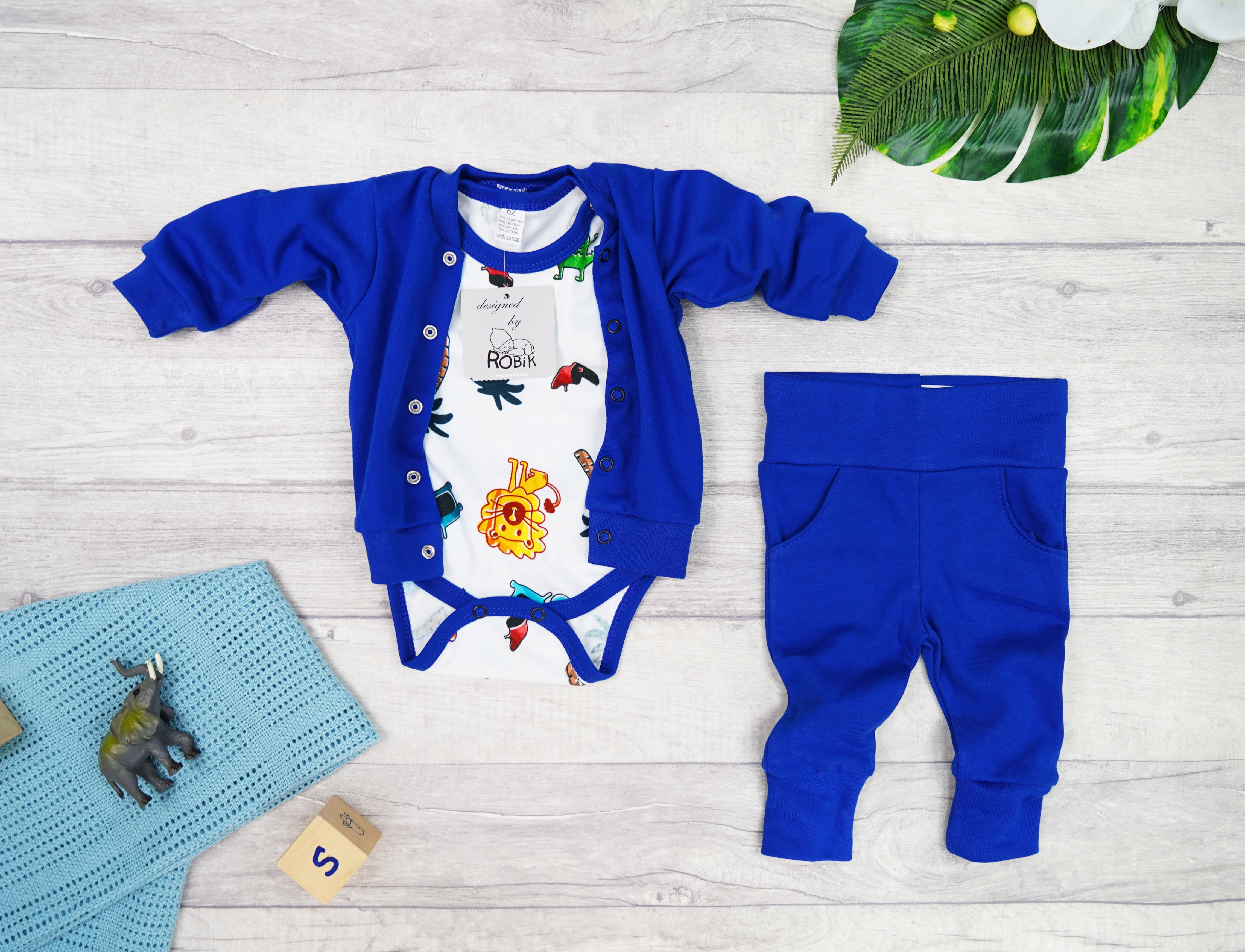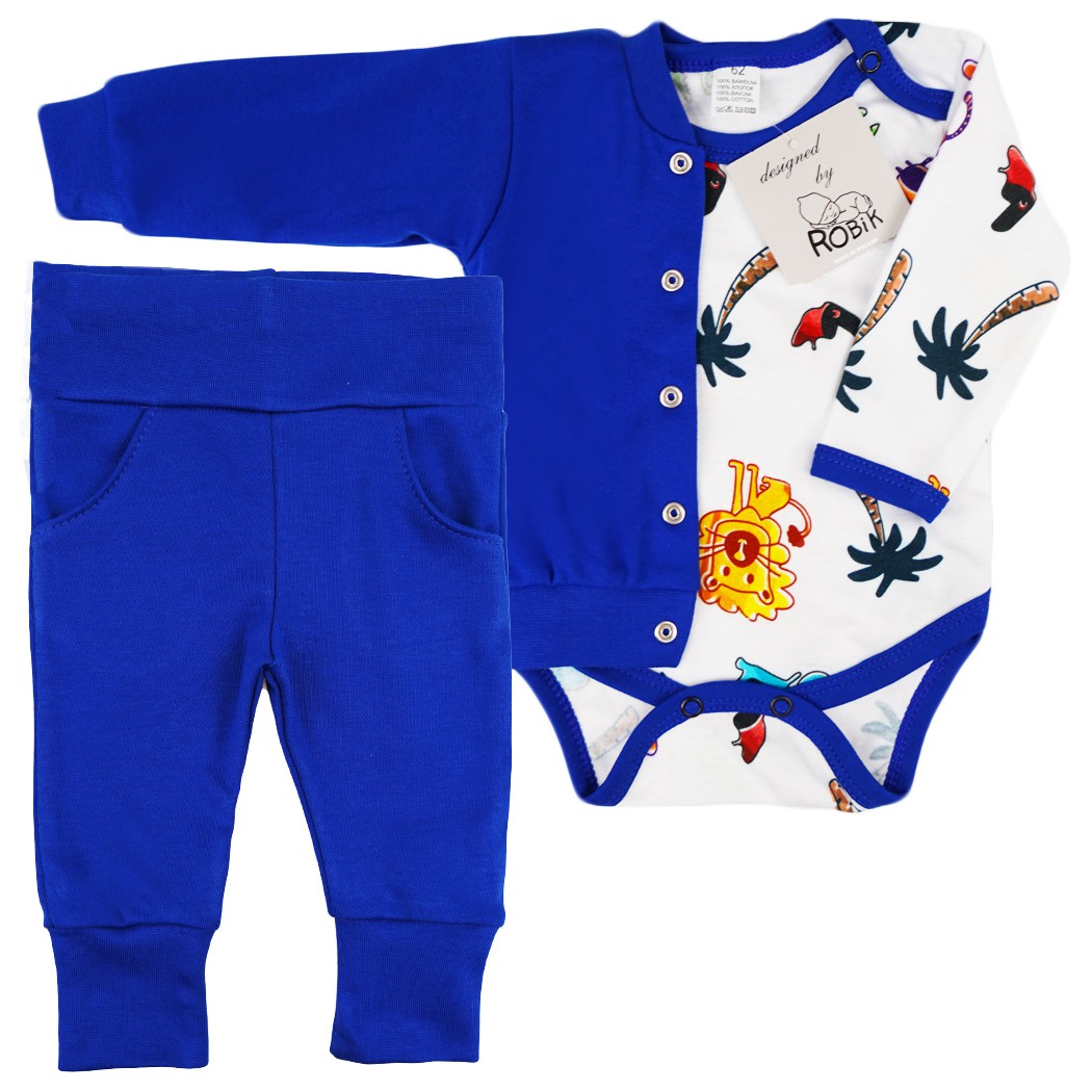 Chabrowy komplet dla niemowlaka w zwierzęta zoo 3-częściowy - body, spodnie z kieszeniami i bomberka.