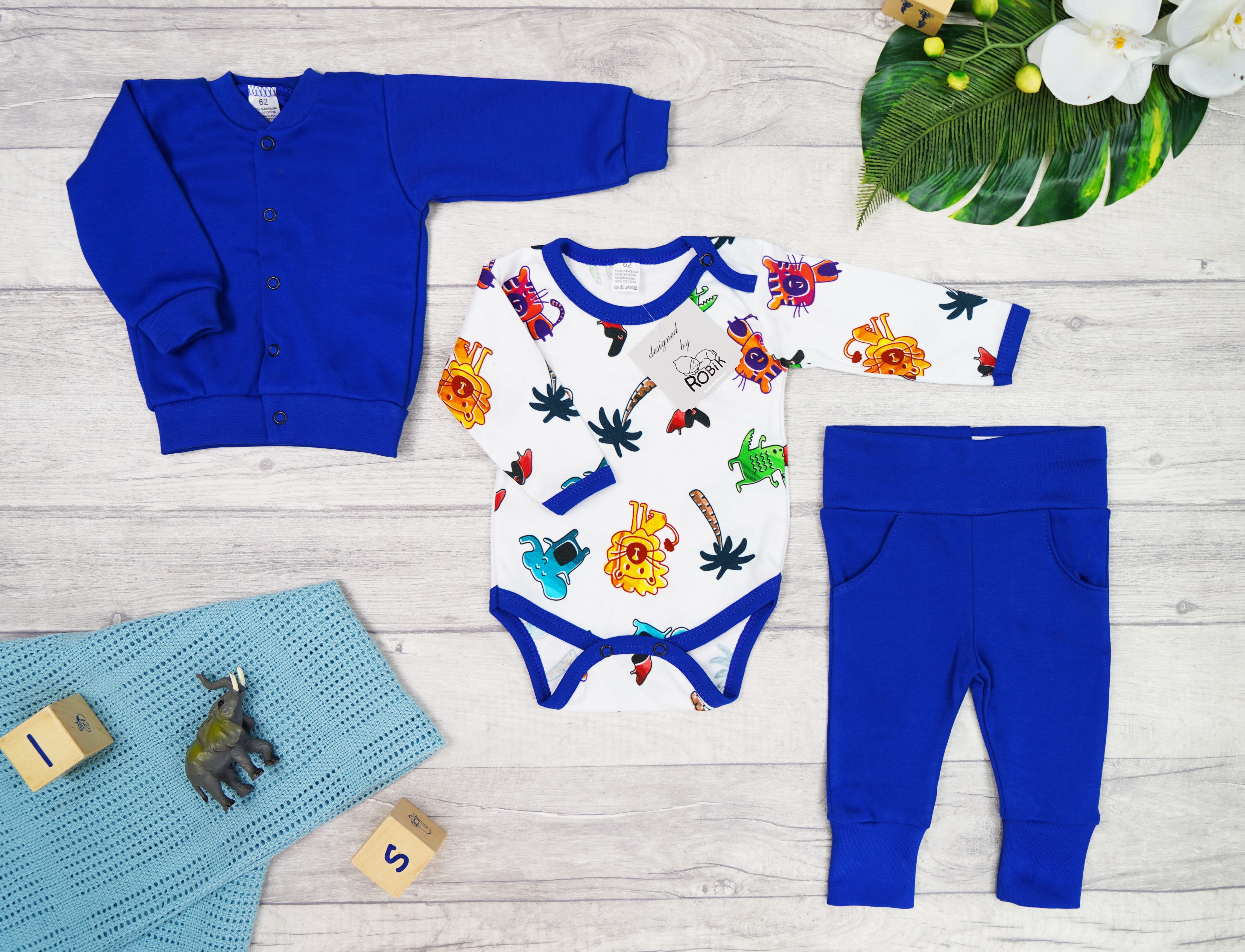 Komplet 3cz body + spodnie + bomberka chabrowy ZOO