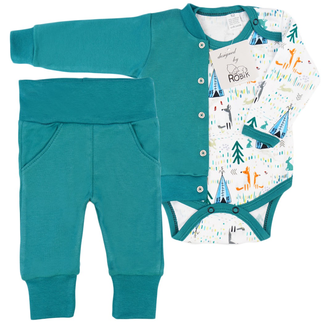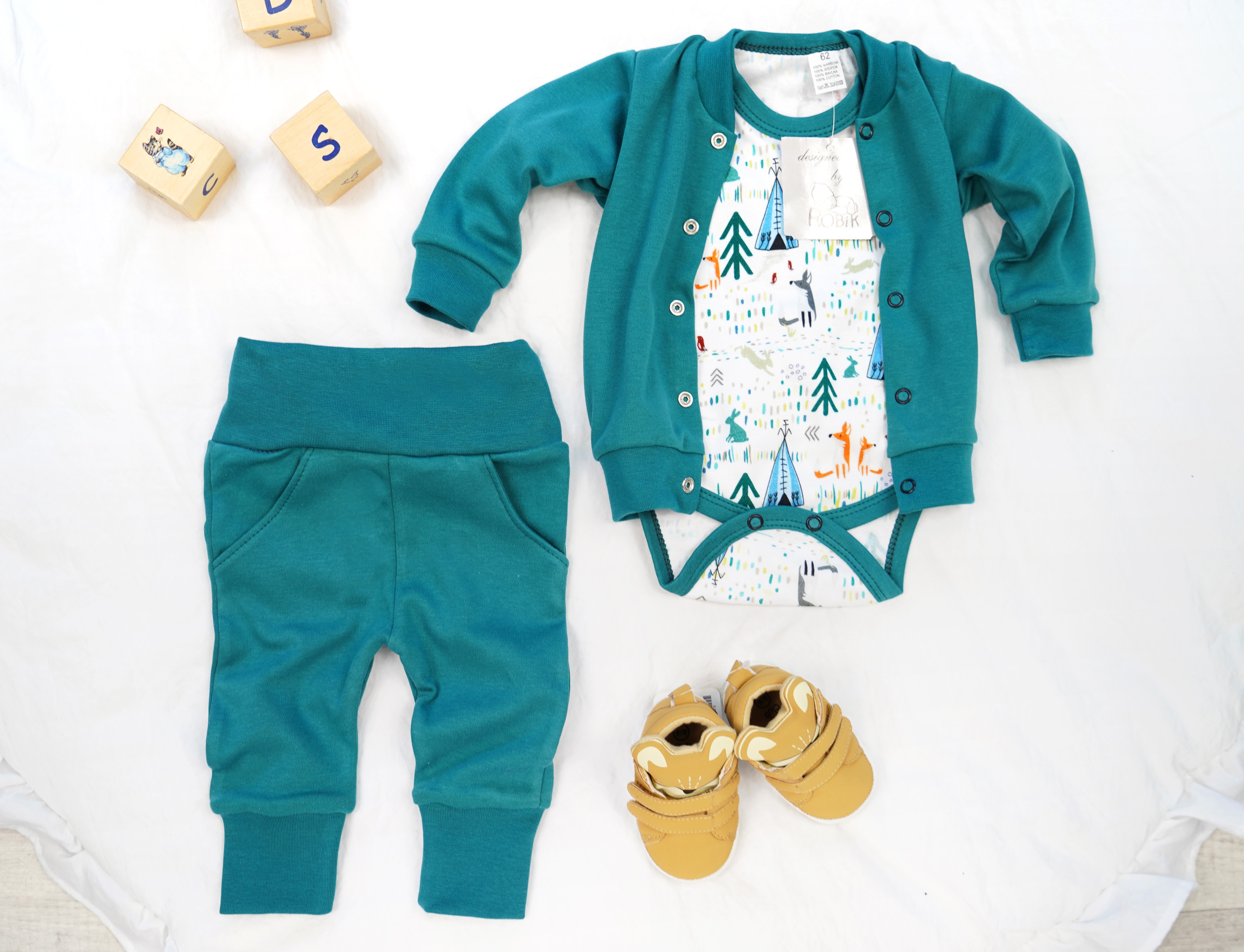 Butelkowo zielony komplet dla niemowlaka w las 3-częściowy - body, spodnie z kieszeniami i bomberka.