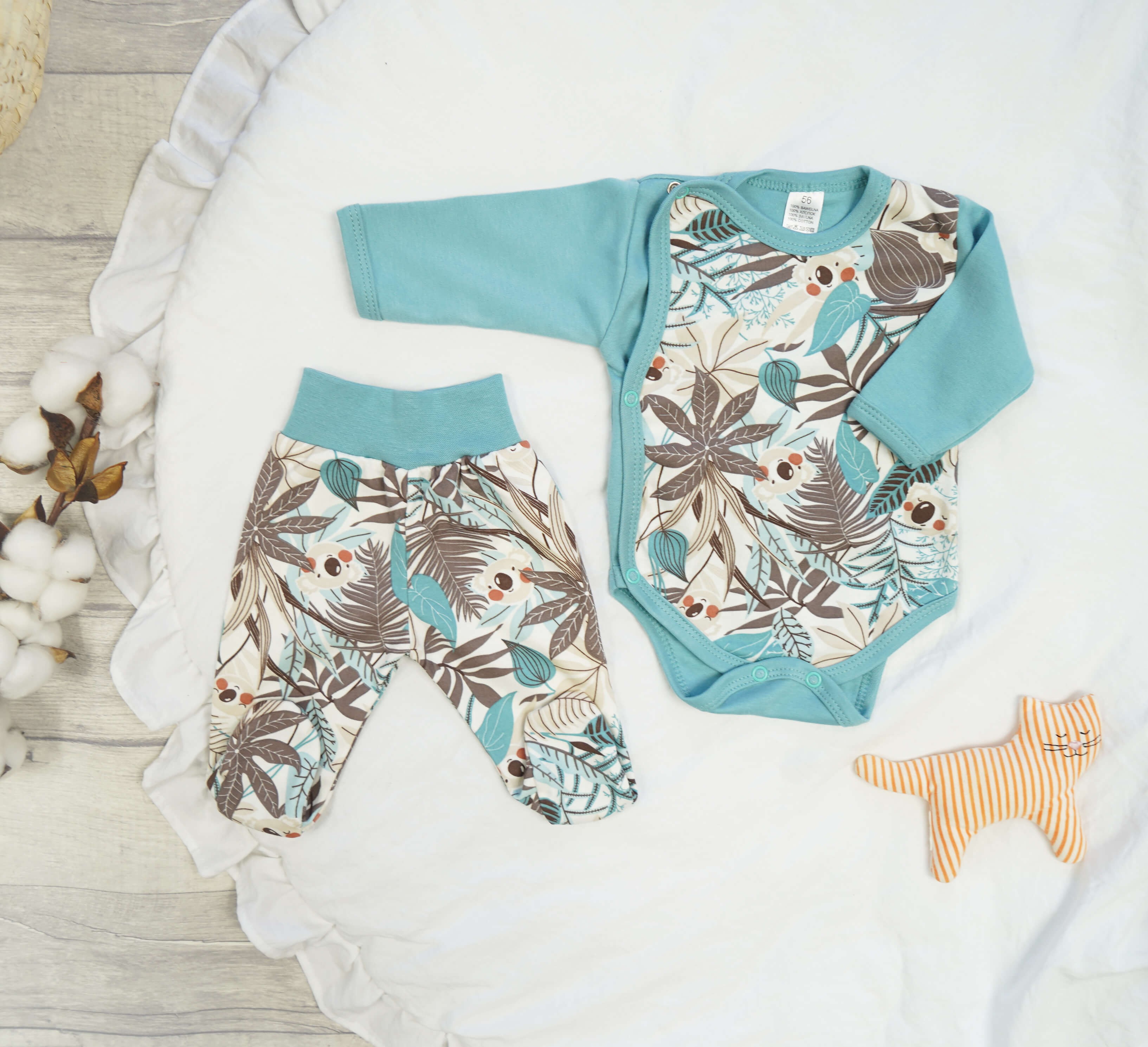 - Body z długim rękawem o kroju kopertowym. Body jest zapinane na dwie pary bezniklowych napek po bokach oraz dwie napki w kroku co znacznie ułatwia zakładanie ubranka
