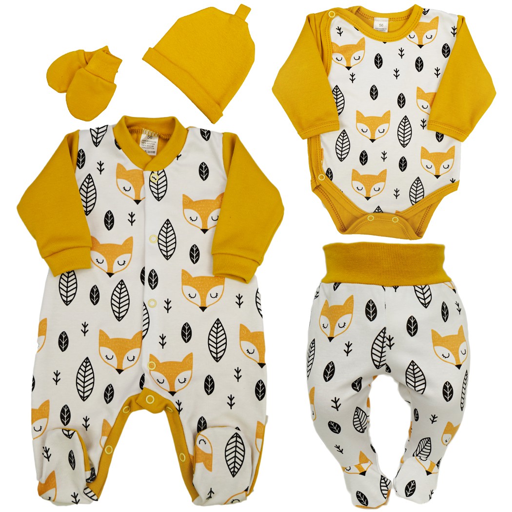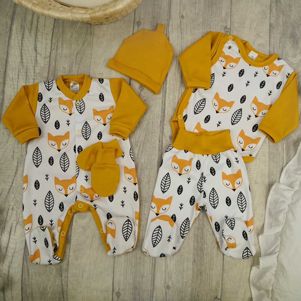 Musztardowy komplet niemowlęcy 5-częściowy w liski - pajac, body kopertowe, półśpiochy, czapeczka, łapki.
