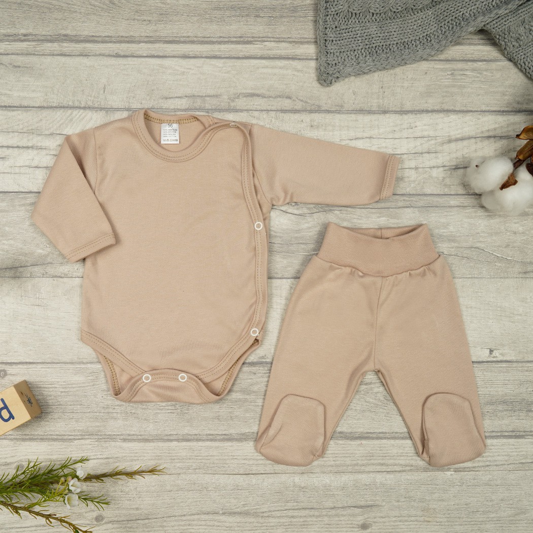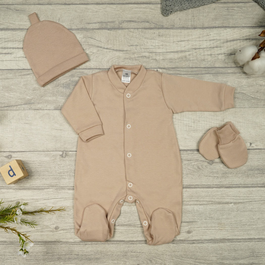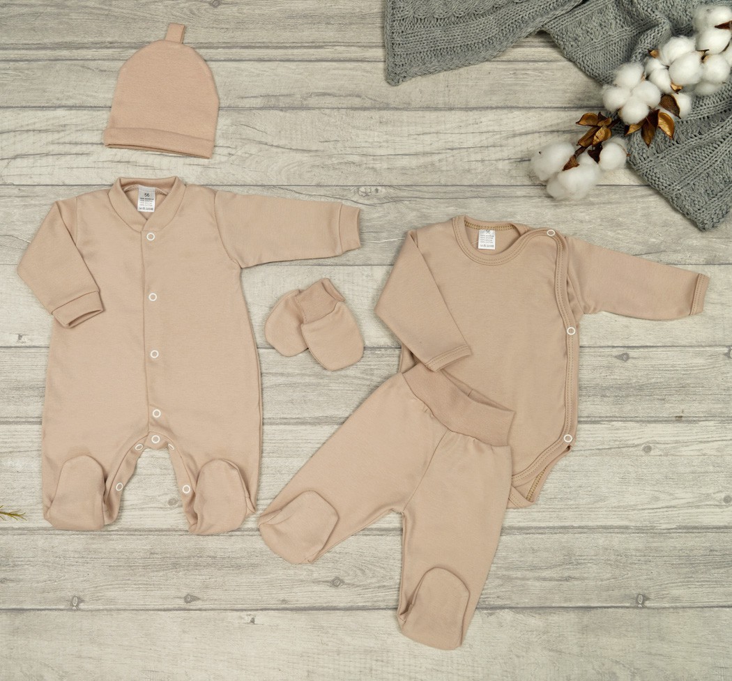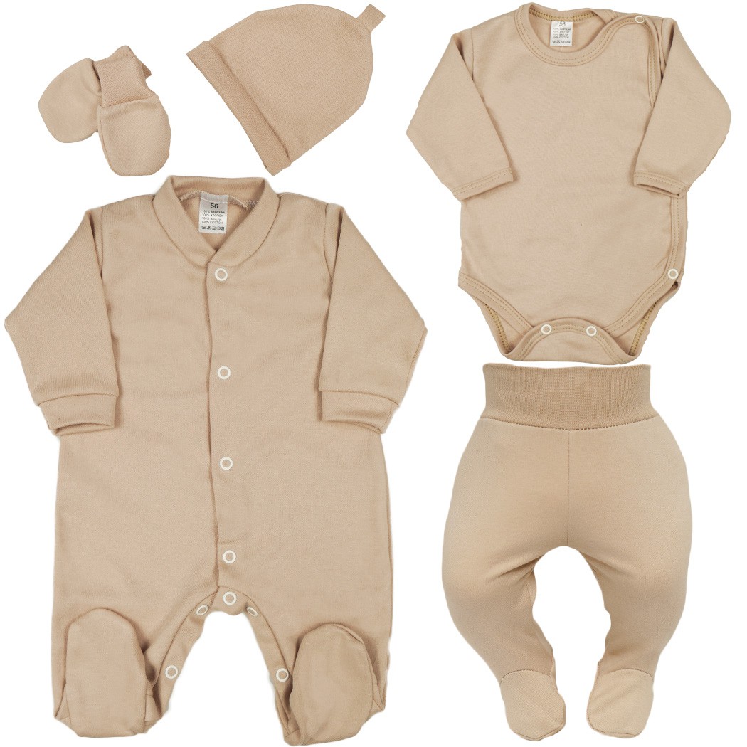 Beżowy komplet niemowlęcy 5-częściowy- pajac, body kopertowe, półśpiochy, czapeczka, łapki.