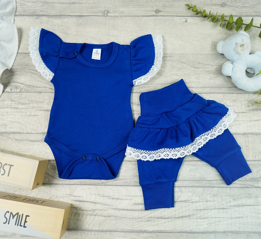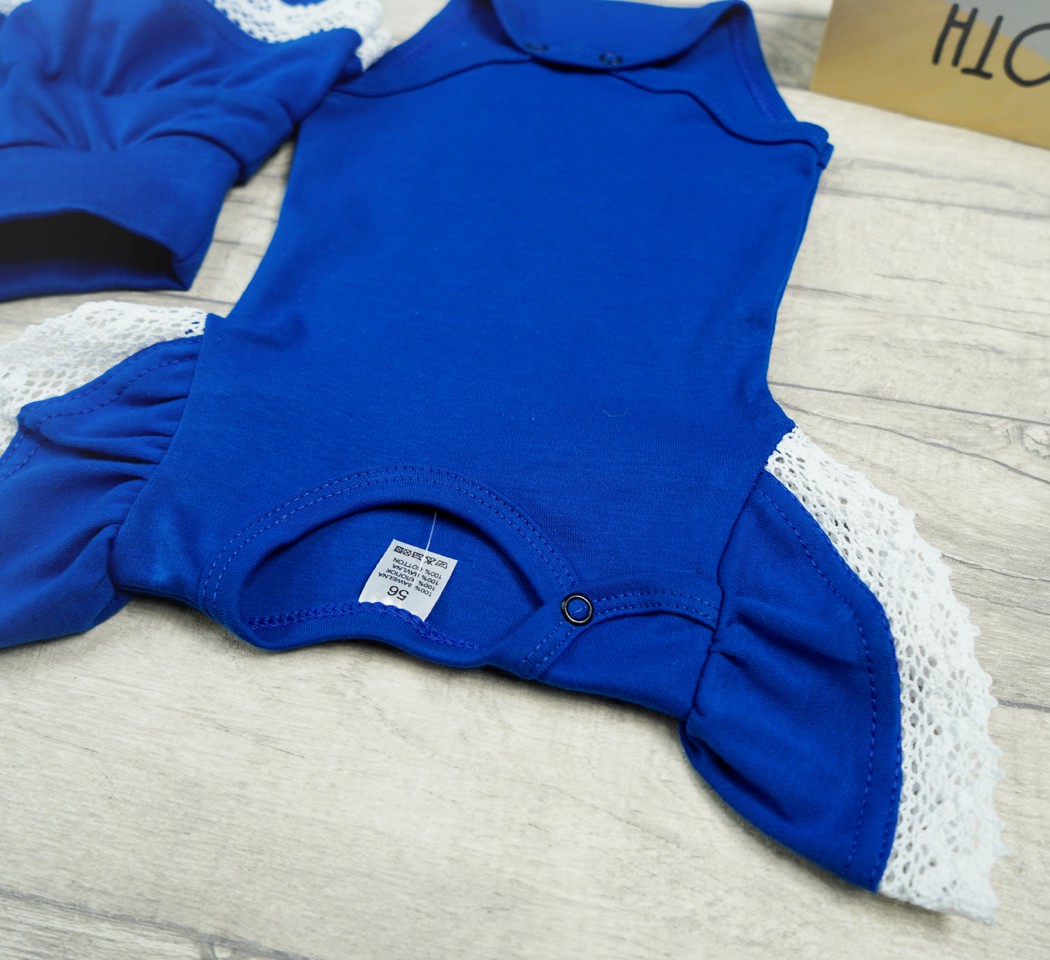 - Body z krótkim rękawem z falbanką wykończoną koronką. Body jest zapinane na bezniklową napkę na ramieniu oraz dwie napki w kroku co znacznie ułatwia zakładanie ubranka.
