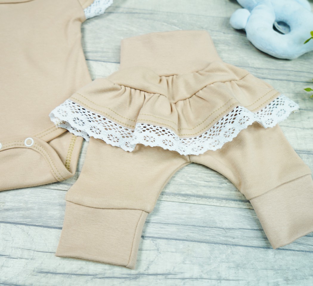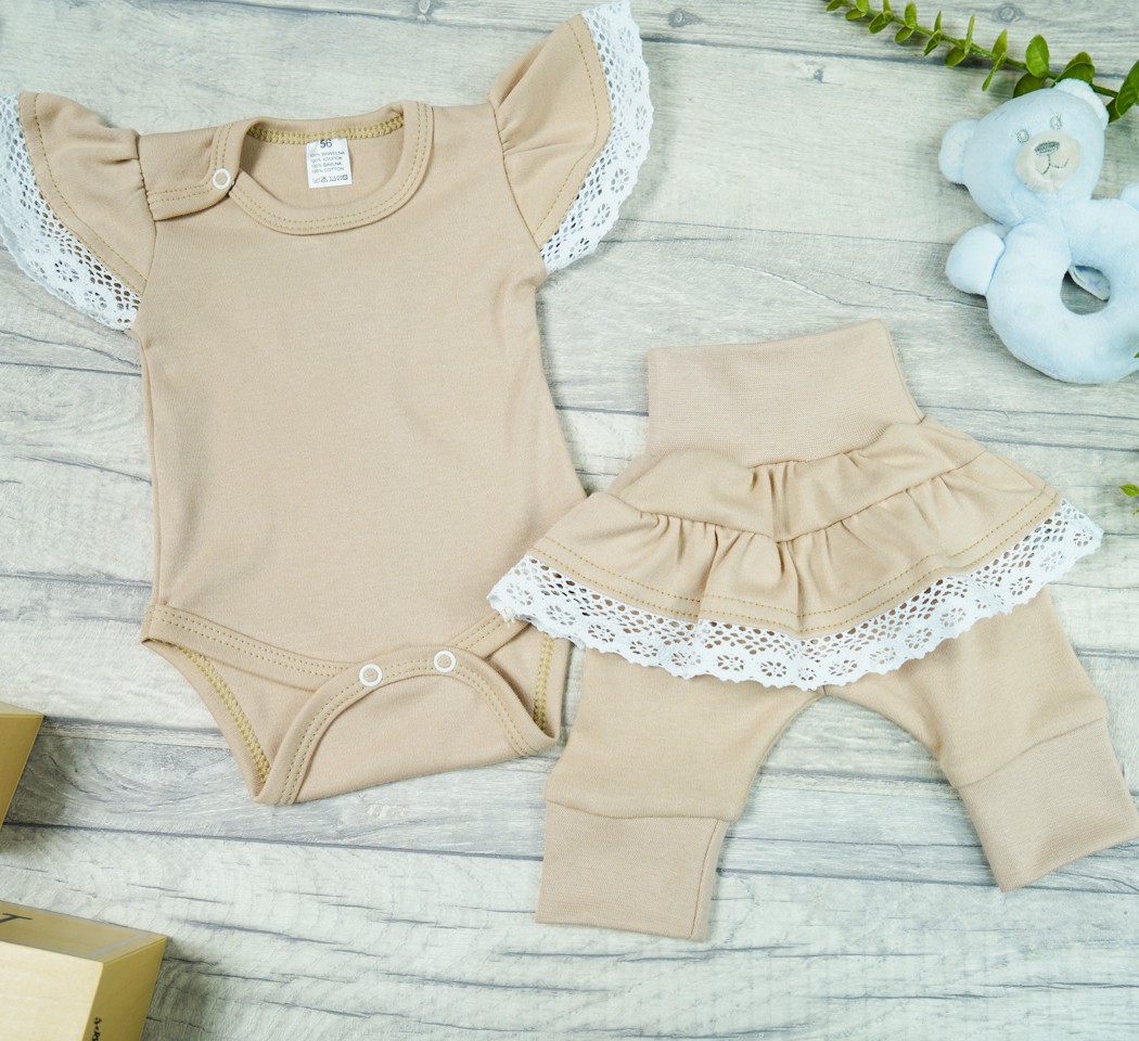 Beżowy komplet dla dziewczynki 2-częściowy - body i spodnie 7/8 z falbanką.
