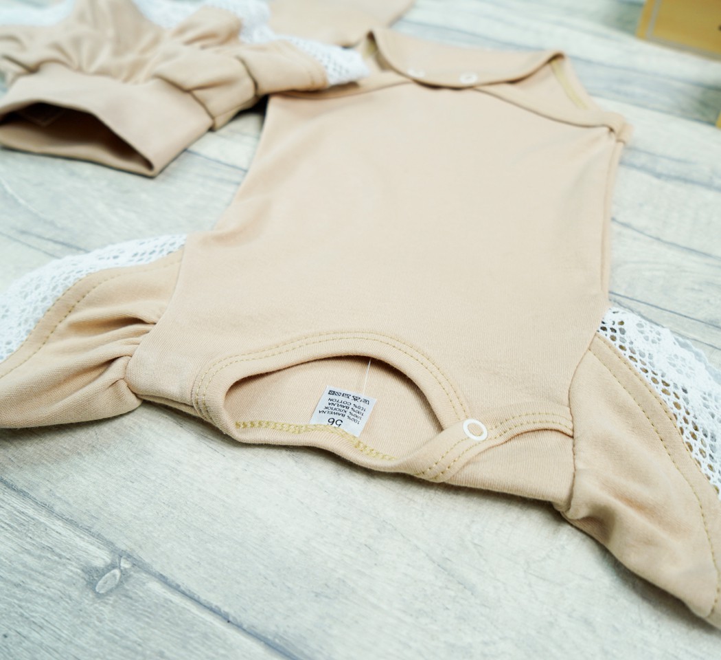 Beżowy komplet 2cz body + spodnie z falbanką koronką HANIA