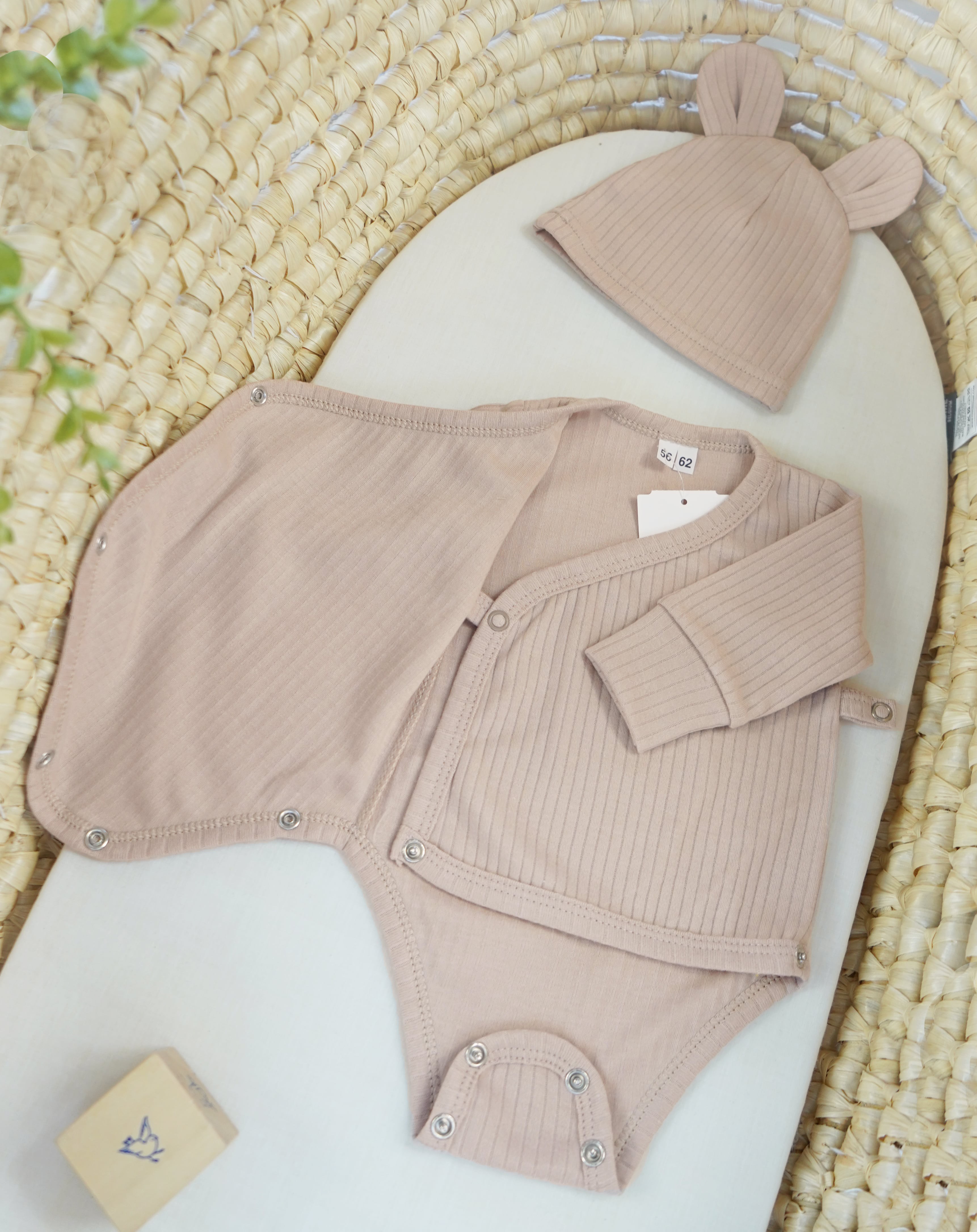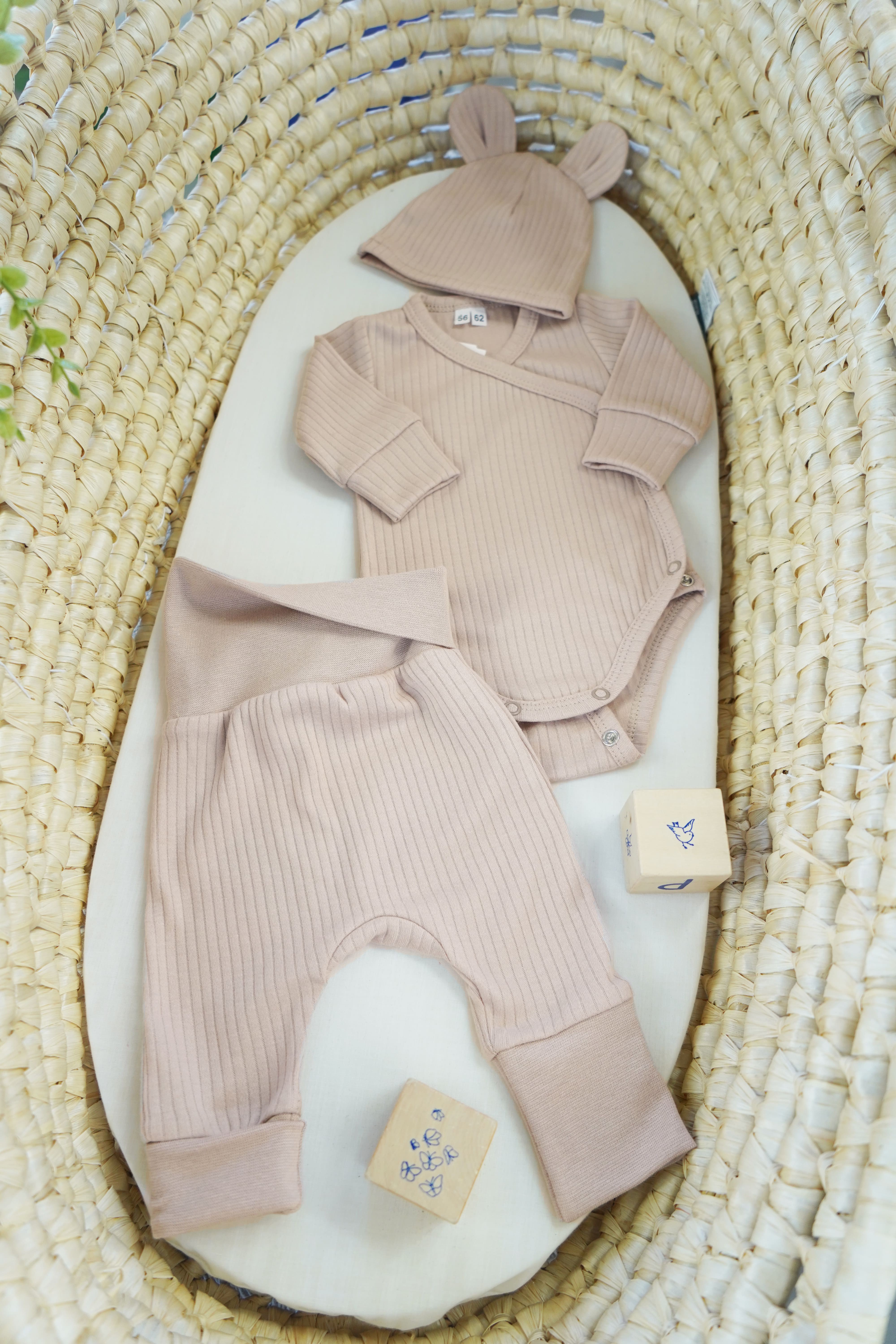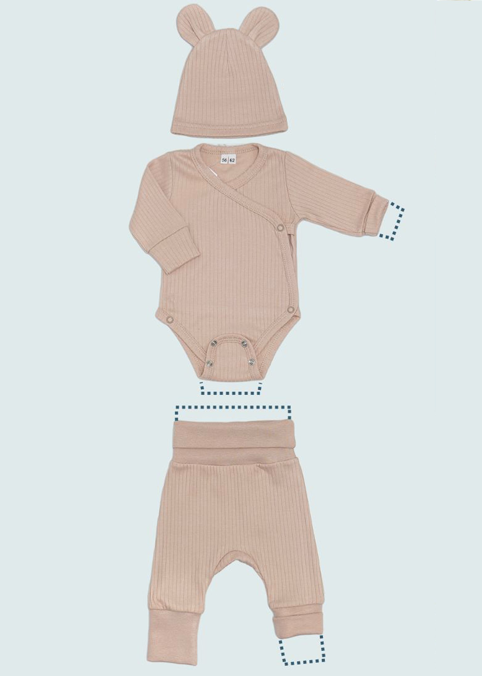 Komplet niemowlęcy z miękkiej, prążkowanej, elastycznej bawełny certyfikowanej. Zestaw stworzony z myślą o wyprawkach i pierwszych miesiącach życia dziecka z powodu regulacji wielkości.