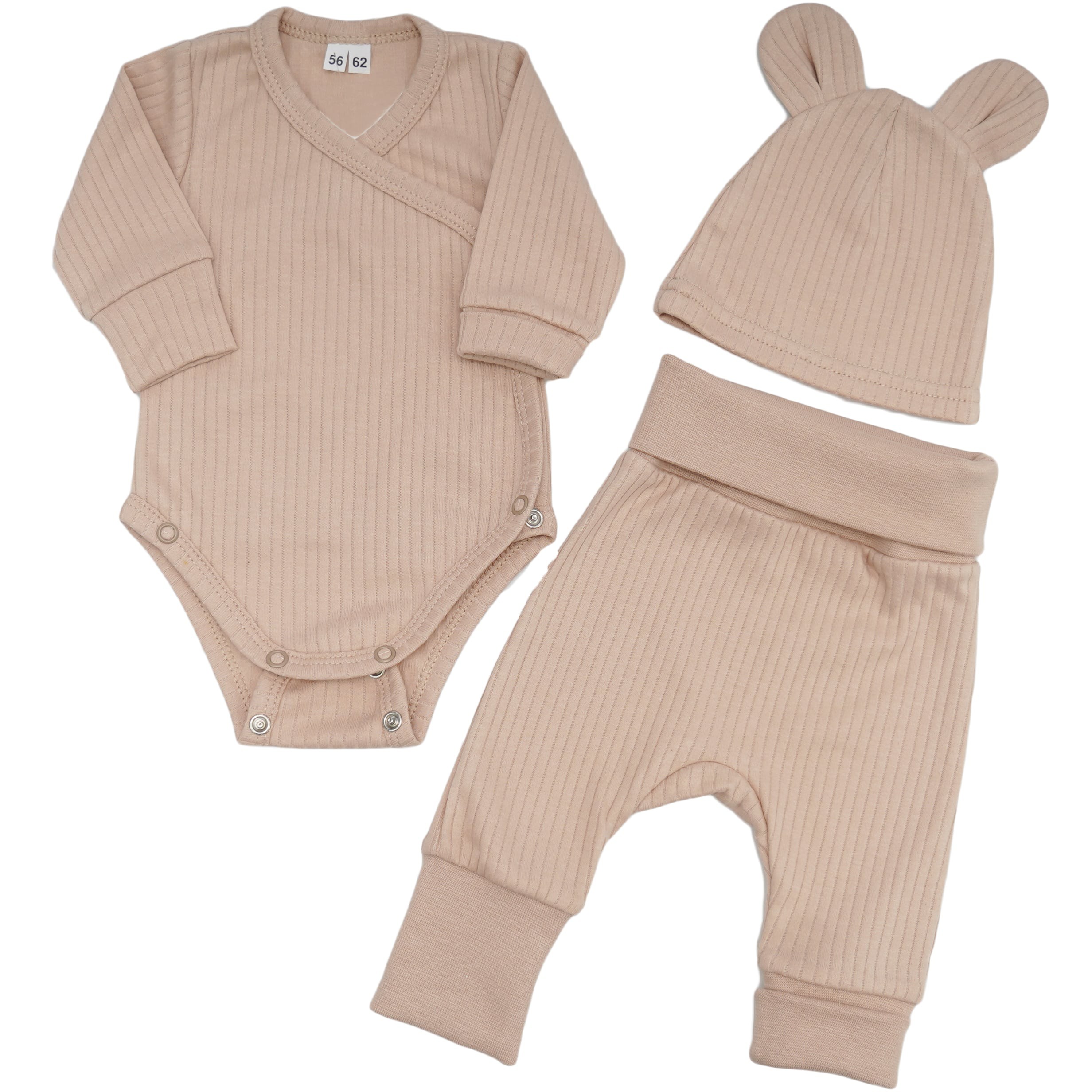 Beżowy komplet niemowlęcy rosnący z regulacją wielkości w prążek body spodnie czapka wyprawka
