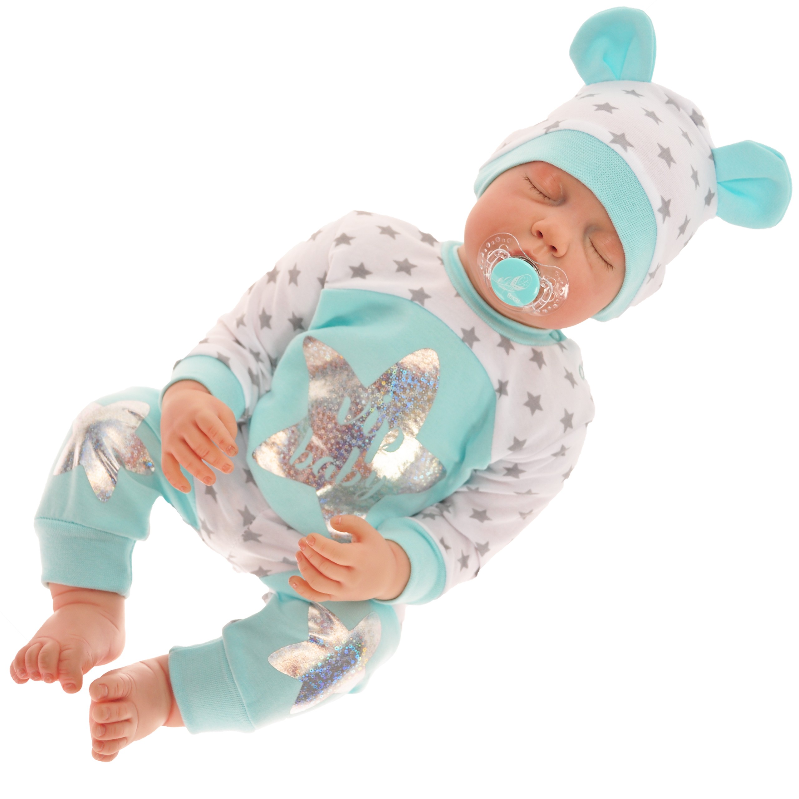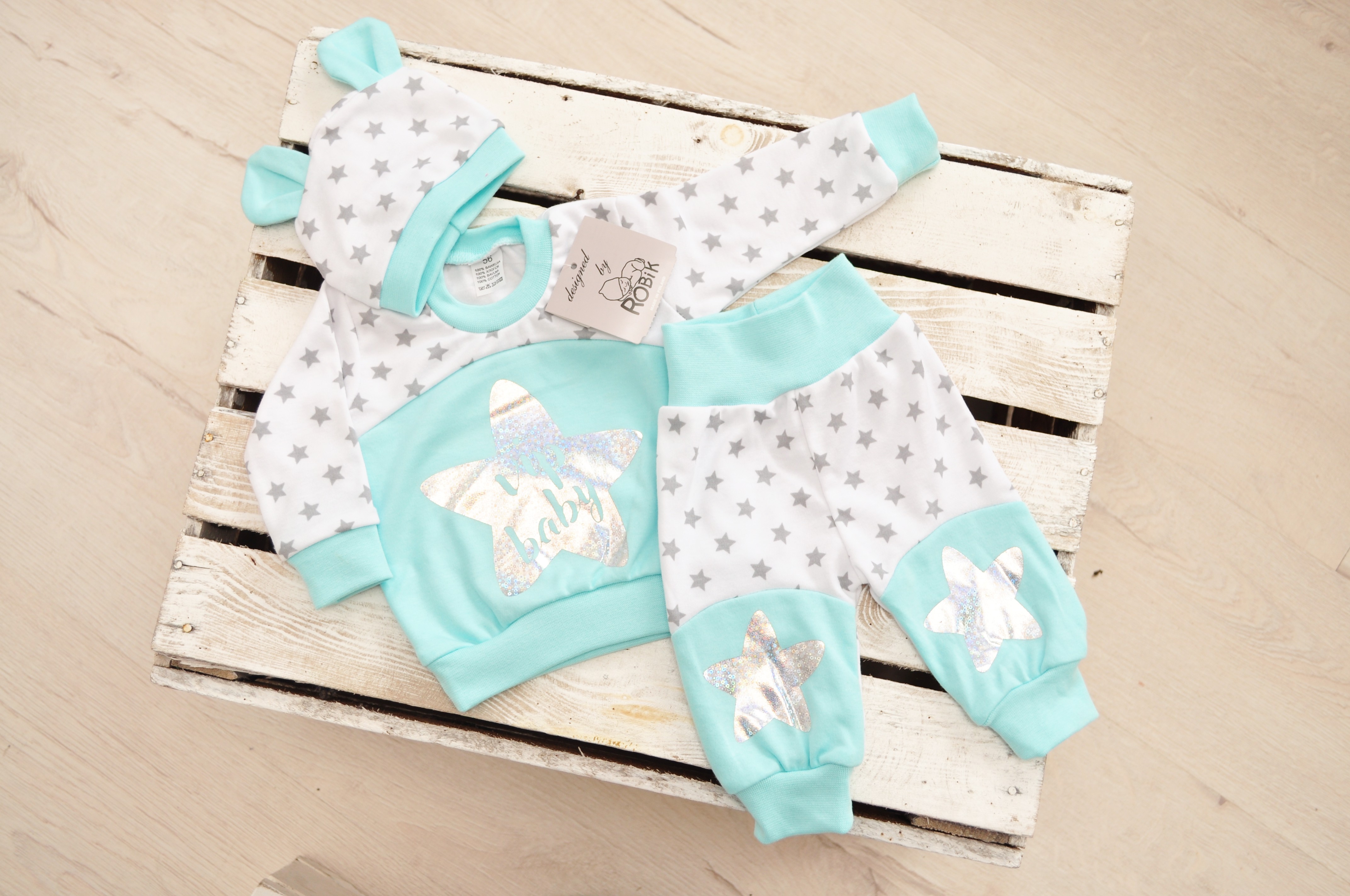 Dostępne w zestawie niemowlęcym spodenki zamiast gumki posiadają w pasie bezuciskowy ściągacz a na nogawkach spodenek zostały nadrukowane srebrne błyszczące gwiazdy. Dopełnieniem tego dziecięcego kompletu dresowego jest zabawna czapeczka z odstającymi uszkami.