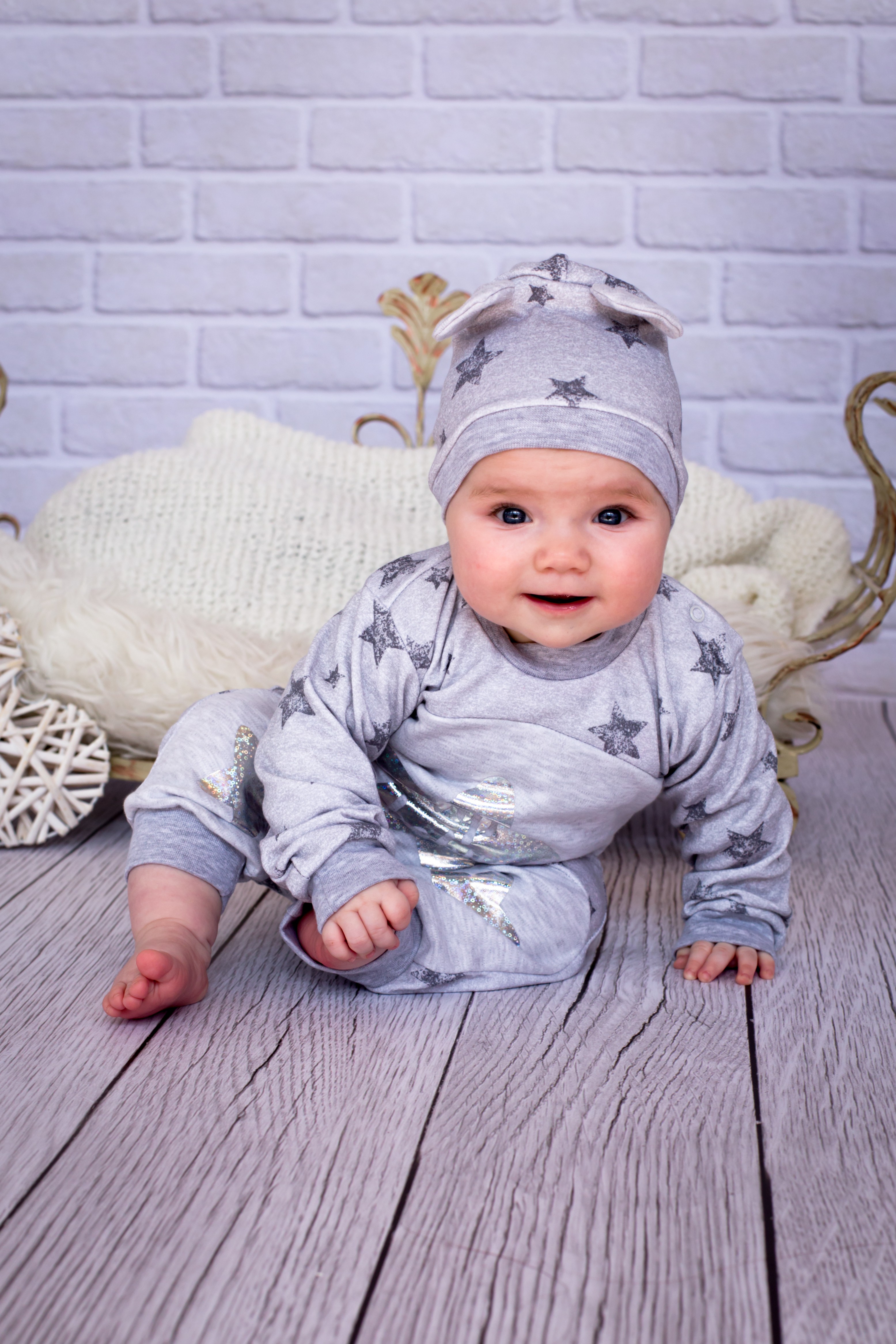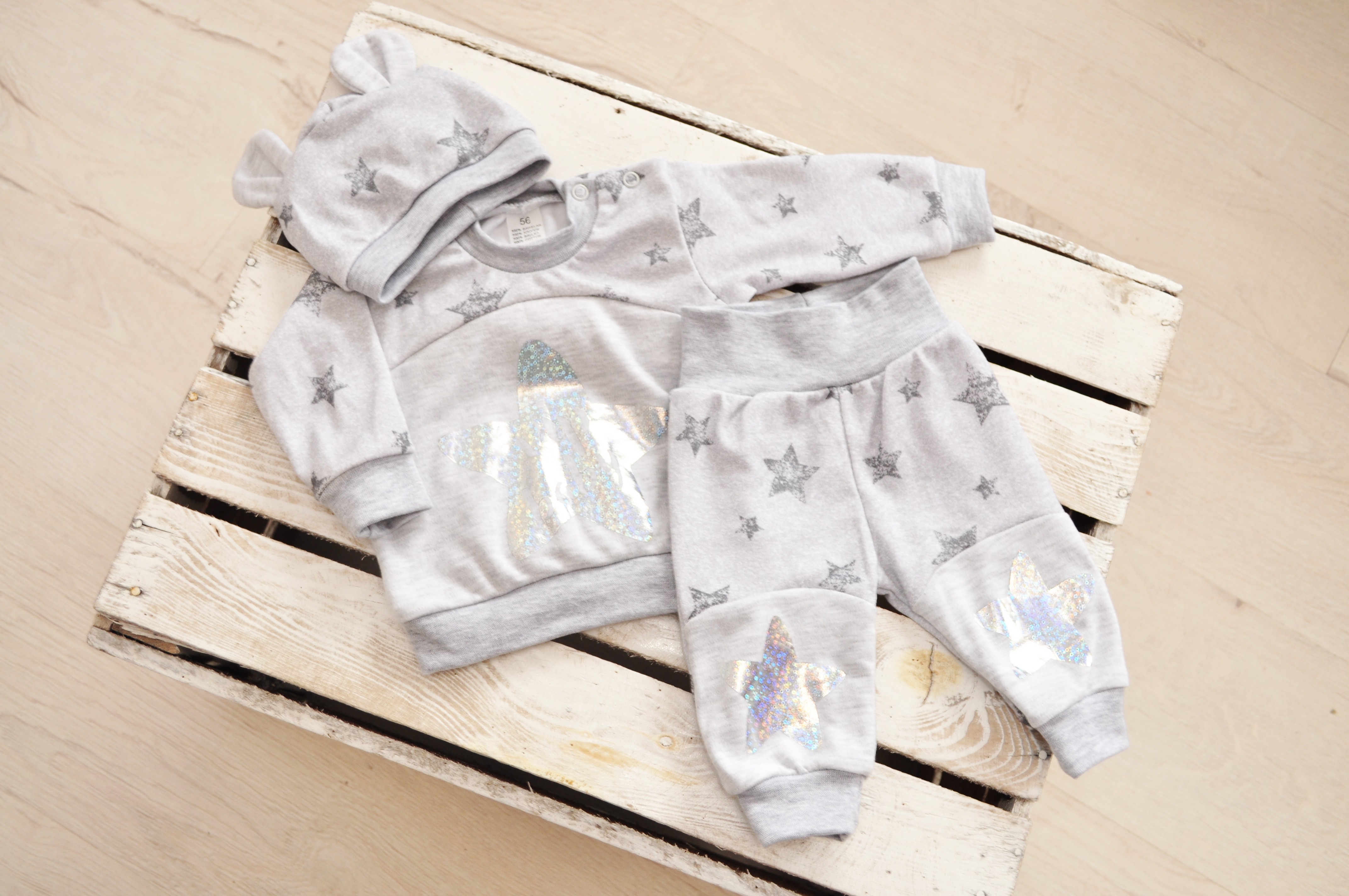 Dostępne w zestawie niemowlęcym spodenki zamiast gumki posiadają w pasie bezuciskowy ściągacz a na nogawkach spodenek zostały nadrukowane srebrne błyszczące gwiazdy. Dopełnieniem tego dziecięcego kompletu dresowego jest zabawna czapeczka z odstającymi uszkami.