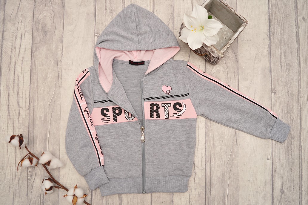 Bluza z dresowa z kapturem w kolorze szarym. Bluza dziewczęca zasuwana przez całą długość na zamek błyskawiczny. Rękawy i dół bluzy zakończone ściągaczem. Z przodu bluza posiada wstawkę z różowego materiału z biało-czarnym napisem SPORTS. Kaptur obszyty od wewnątrz różową bawełną a rękawy posiadają ozdobne różowe lampasy z napisami. Bluza posiada dwie wpuszczane kieszenie.
