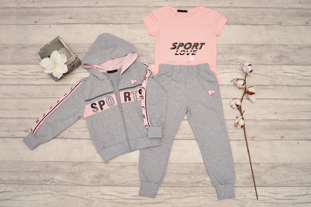 Komplet dziewczęcy 3-częściowy w skład którego wchodzą: szare spodnie, różowa bluzka oraz szara bluza z kapturem.