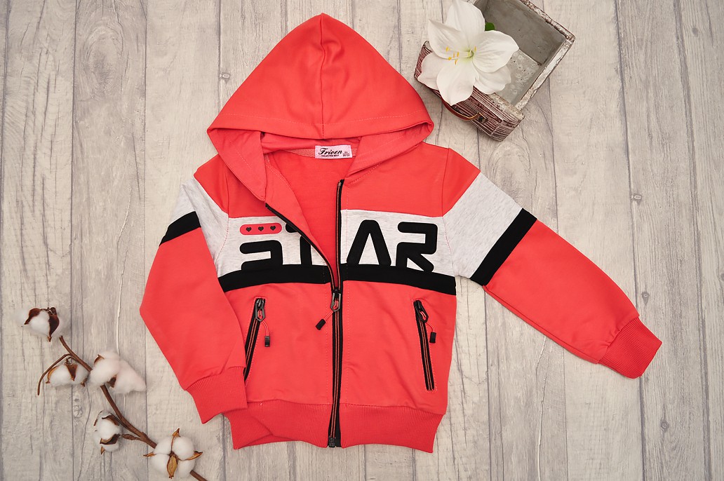 Bluza z dresowa z kapturem w kolorze malinowym. Bluza dziewczęca zasuwana przez całą długość na zamek błyskawiczny. Rękawy i dół bluzy zakończone ściągaczem. Z przodu bluza posiada wstawki z czarnego i szarego materiału z czarną aplikacją z napisem STAR. Kaptur obszyty od wewnątrz malinową bawełną a rękawy posiadają ozdobne wstawki w czarnym i szarym kolorze. Bluza posiada dwie wpuszczane kieszenie zasuwane na suwaki.