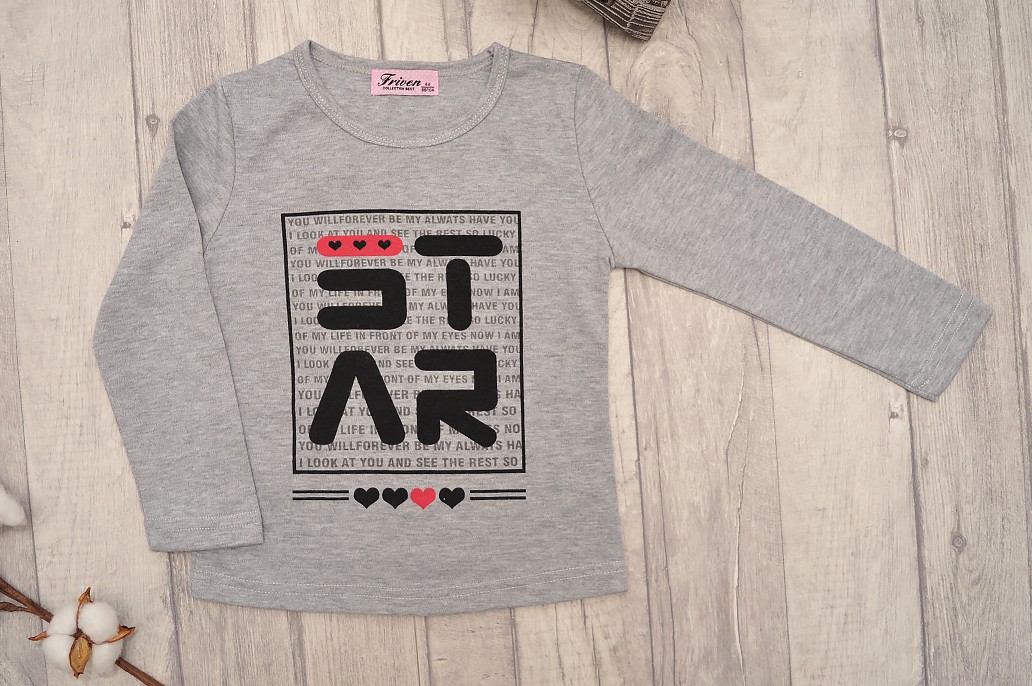 Szara bluzeczka z długim rękawem z nadrukiem napisów i serduszek.
