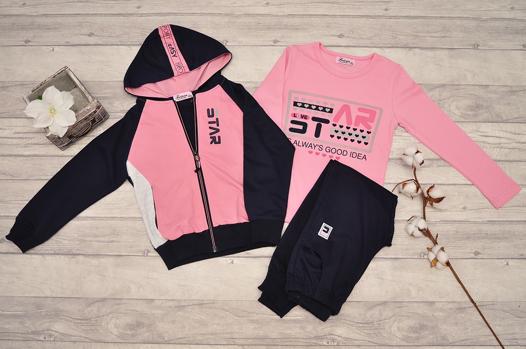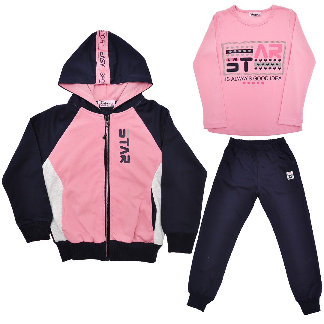 DRES dziewczęcy STAR2 granatowo-różowa bluza z kapturem, spodnie, bluzka, komplet 3cz.