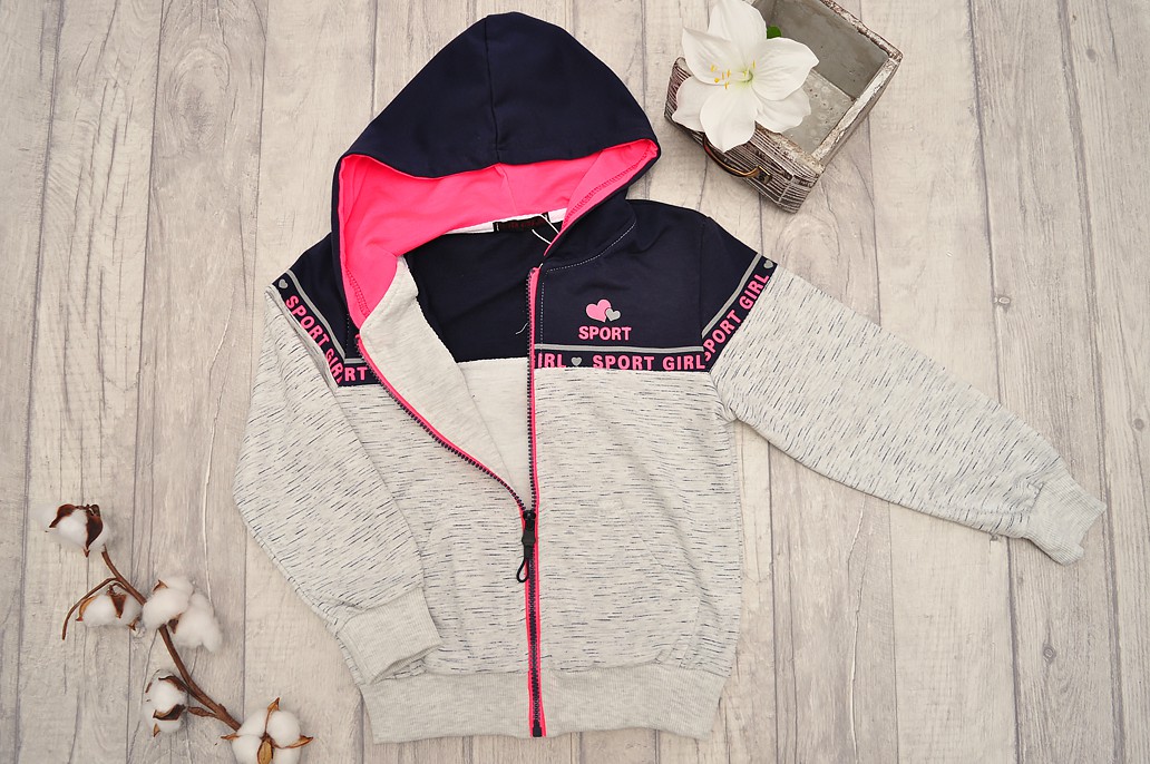 Bluza z dresowa której dół oraz rękawy uszyte są z dzianiny w kolorze szarym melanż. Góra oraz kaptur bluzy w kolorze granatowym. Bluza dziewczęca zasuwana przez całą długość na zamek błyskawiczny. Rękawy i dół bluzy zakończone ściągaczem. Z przodu bluza posiada różowe napisy SPORT GIRL. Kaptur obszyty od wewnątrz różową bawełną. Bluza posiada dwie zewnętrzne kieszenie.