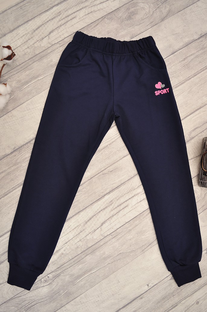 Spodenki dresowe w kolorze granatowym posiadają gumkę w pasie i dwie wewnętrzne kieszenie. Obok jednej kieszonki ozdobny nadruk serduszek i napisu SPORT. Nogawki wykończone ściągaczami.