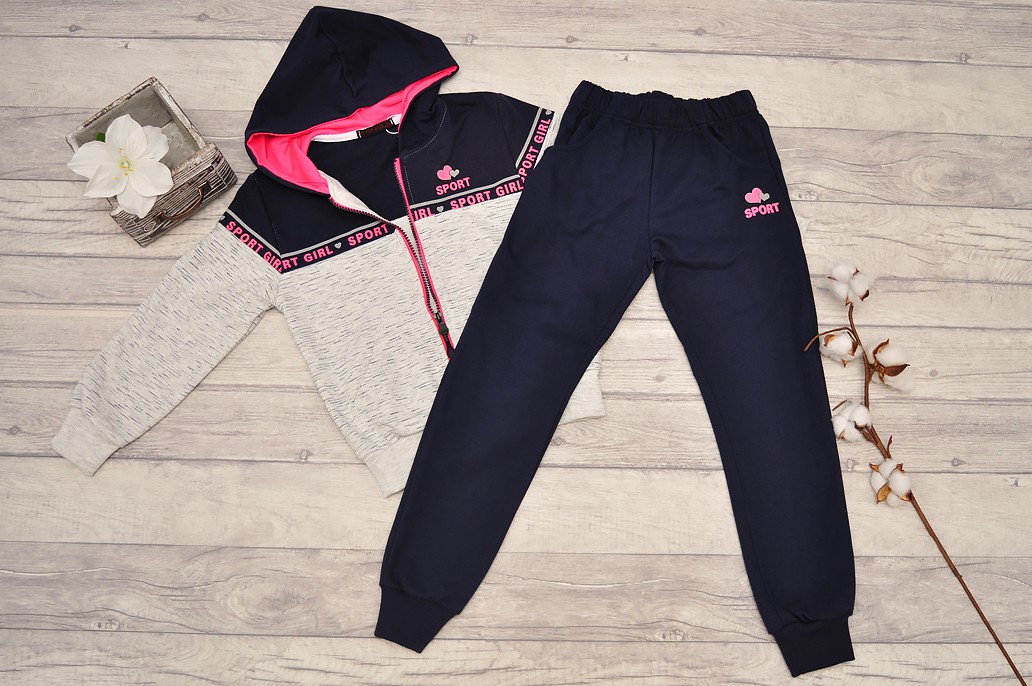 Komplet dziewczęcy 2-częściowy w skład którego wchodzą: granatowe spodnie, oraz szaro-granatowa bluza z kapturem.