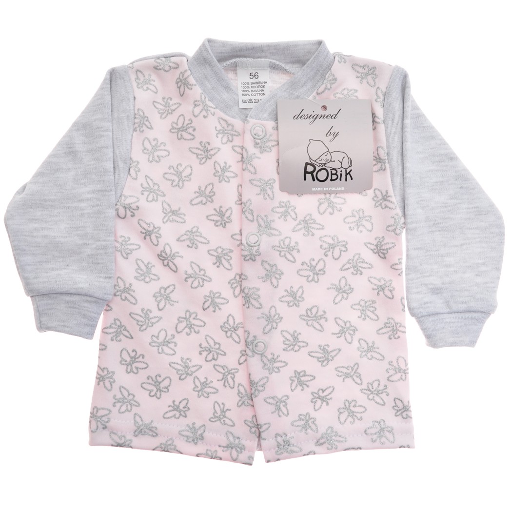 Szaro-różowy KAFTANIK w motylki r.56-68 KOSZULKA BAWEŁNIANA brokat wzór 340S