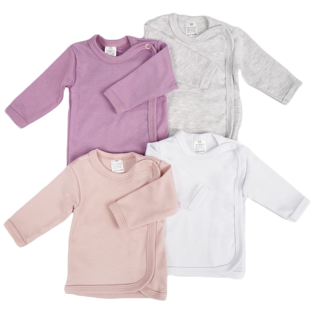 Cztery koszulki kopertowe dla niemowląt zapinana na napkę.