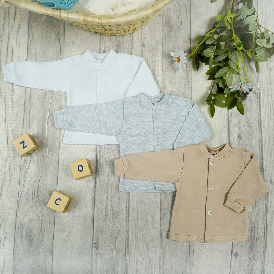 Trzy kaftaniki dla niemowlaka w kolorach: białym, beżowym i szarym