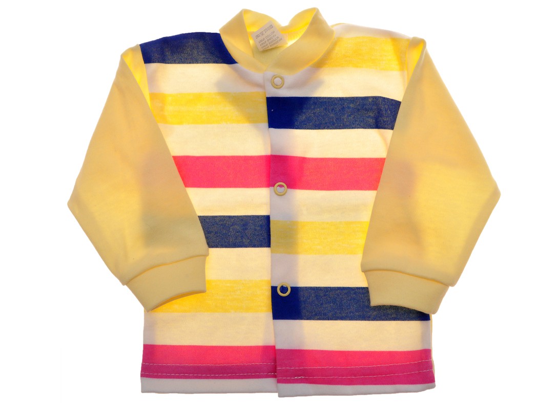 Żółty kaftanik dla niemowlaka w szerokie pasy.