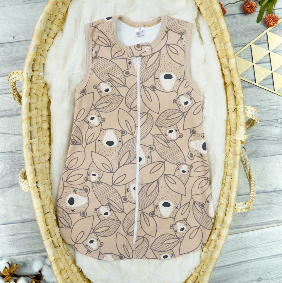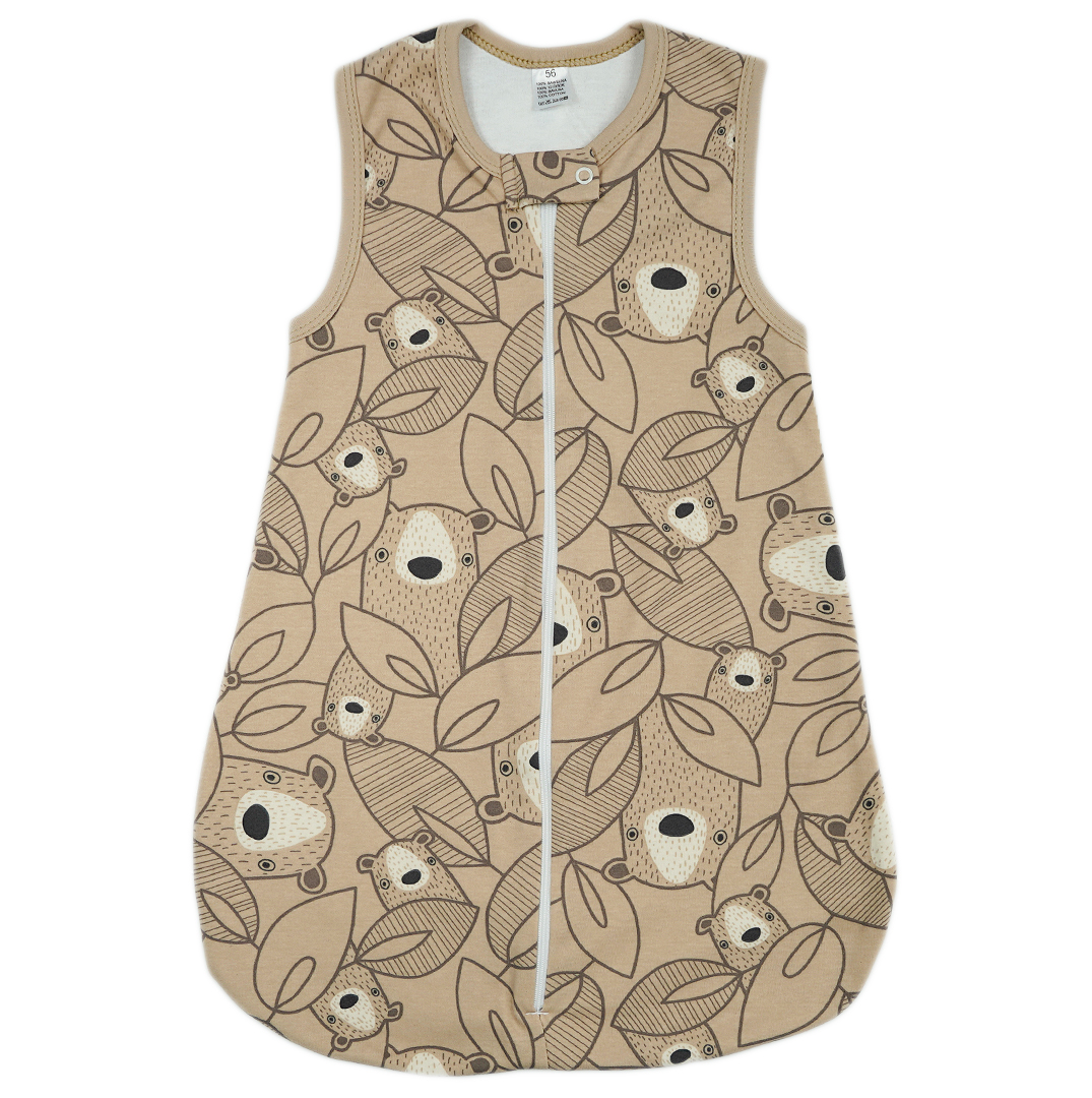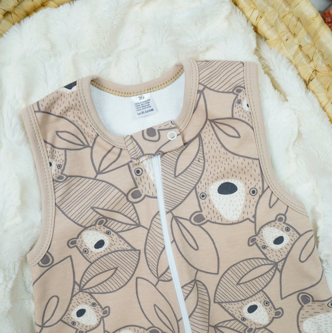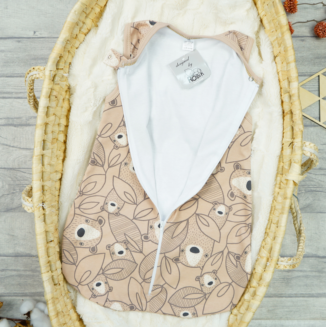 Bawełniany śpiwór niemowlęcy zapewniający komfort oraz wygodę ruchów malucha podczas snu. Zapinany przez całą długość na suwak oraz ochronną klamerkę z bezniklowym napem pod szyją. Uszyty z 2 warstw 100% bawełny, zewnętrzna w kolorze beżowym drukowana w misie, wewnętrzna gładka, biała. Dekolt i ramiona wykończone wygodnymi, nieuciskającymi lamówkami dają możliwość wygodnego ubrania dziecka pod spodem. Szeroki dół śpiworka zapewnia swobodę ruchów nogami i bezpieczeństwo dla bioderek.
