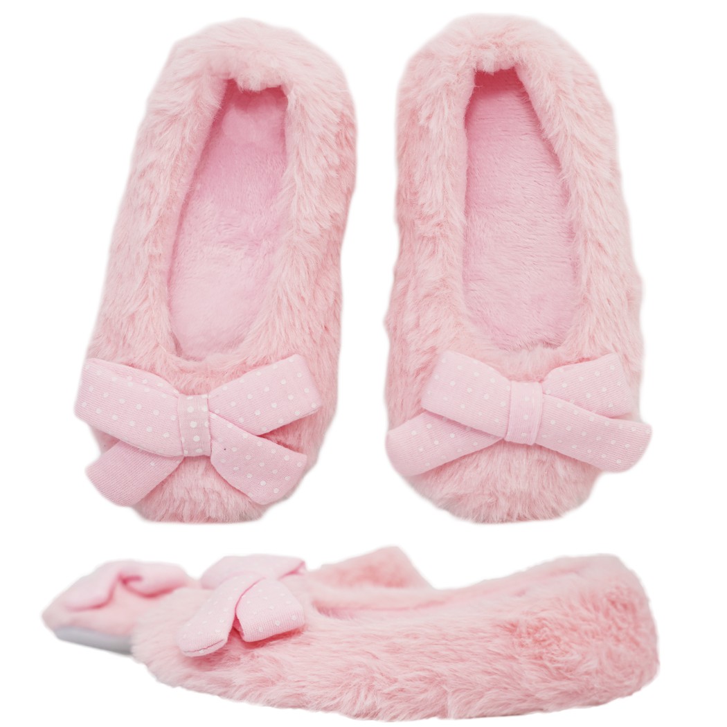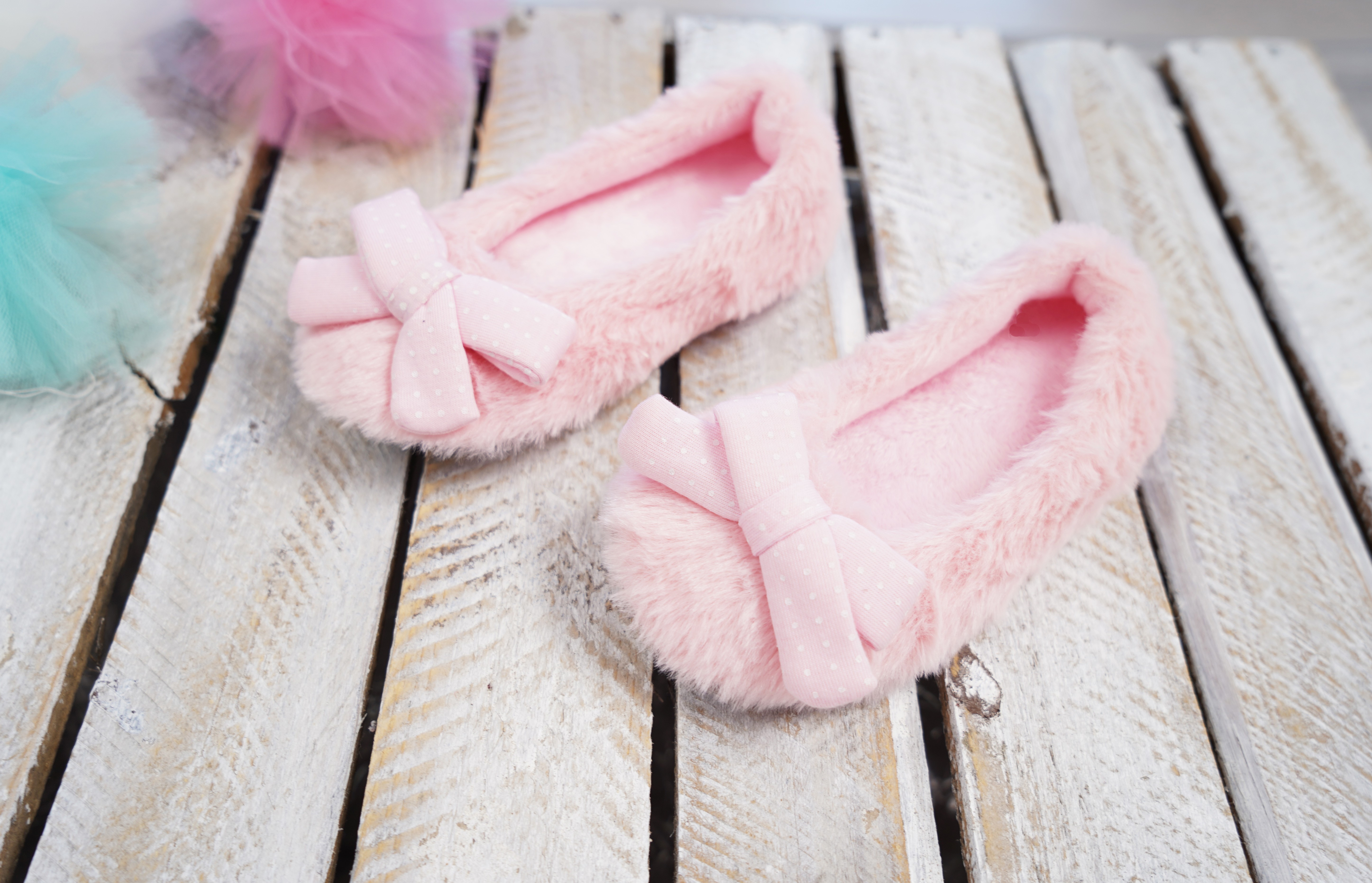 Różowe kapcie dziewczęce, miękkie baleriny z ozdobną kokardą w kropeczki.
