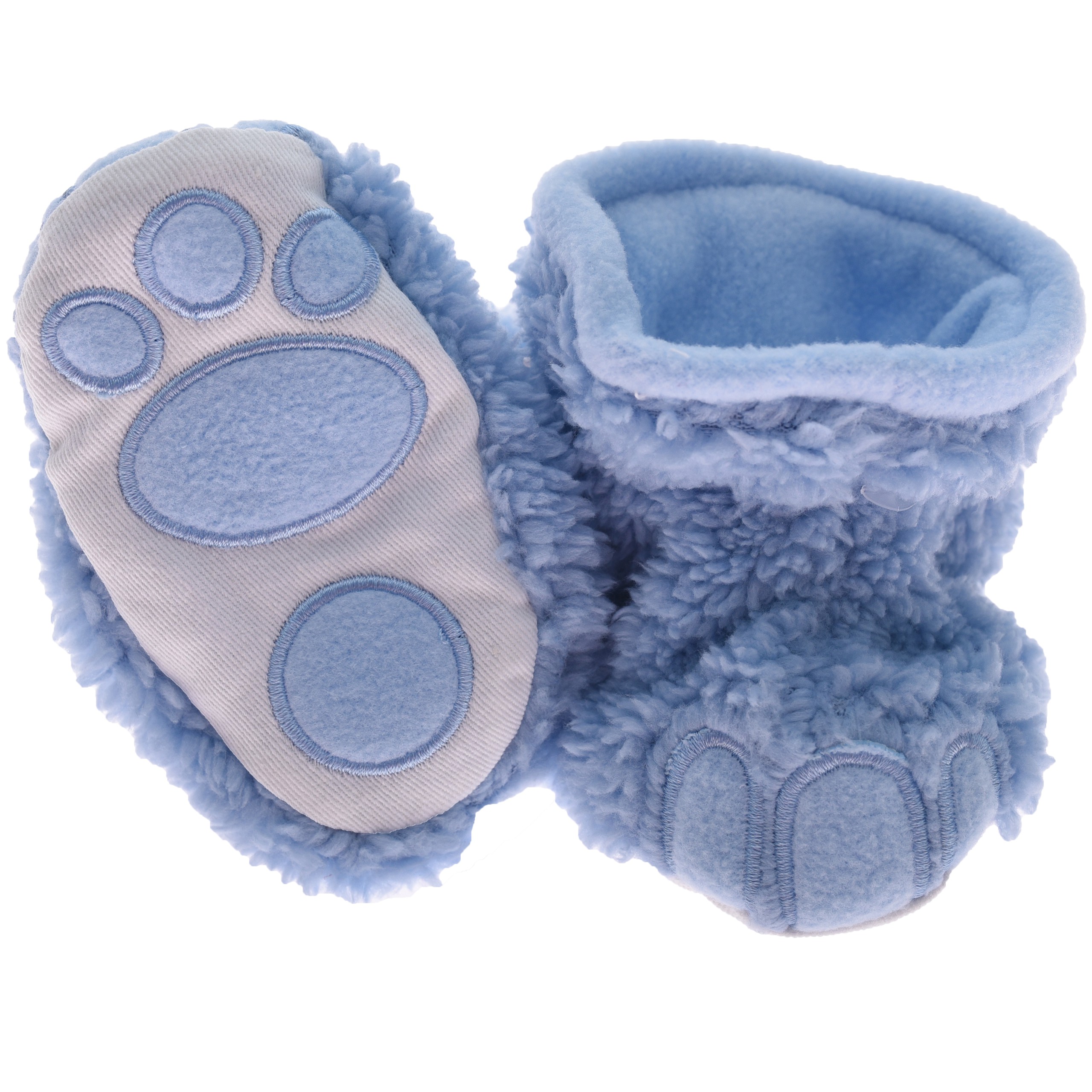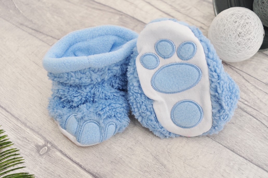 Błękitne buciki niechodki dla niemowlaka idealne na zimniejsze dni. Puchate kapcie niemowlęce w kształcie imitujące lwie łapki świetnie dopasowują się do małych stópek. Wykonane z materiału typu miś i ocieplone od wewnątrz miękkim polarem zapewnią dziecku uczucie ciepła. Niechodki niemowlęce idealnie nadają się na spacery, do wózka jak i do domu.