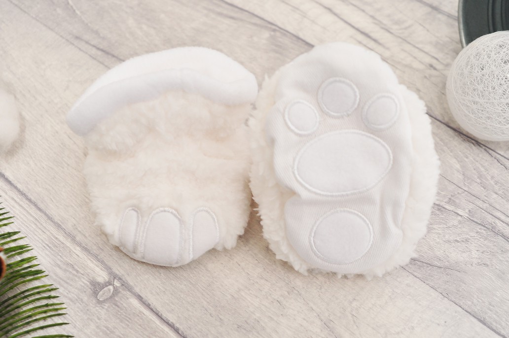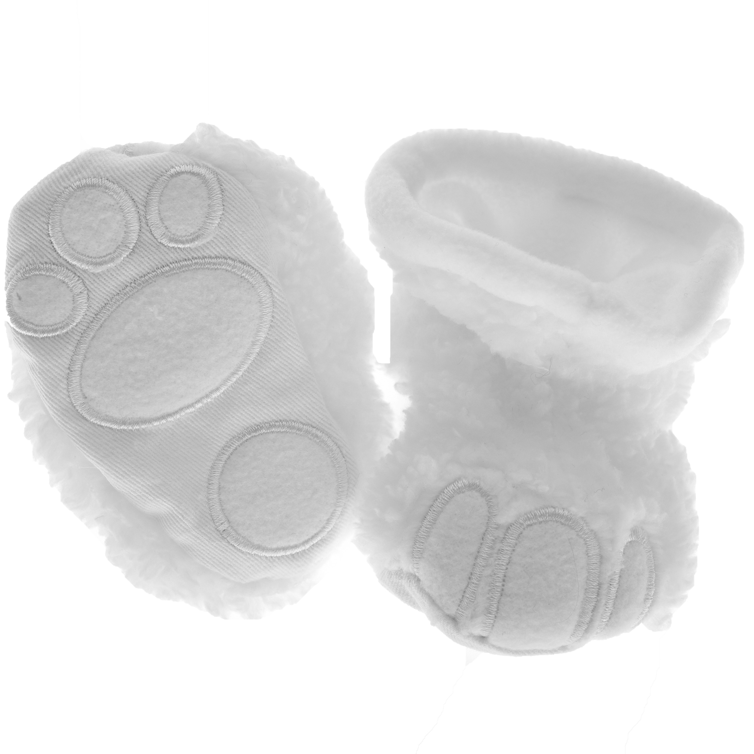 Białe buciki niechodki dla niemowlaka idealne na zimniejsze dni. Puchate kapcie niemowlęce w kształcie imitujące lwie łapki świetnie dopasowują się do małych stópek. Wykonane z materiału typu miś i ocieplone od wewnątrz miękkim polarem zapewnią dziecku uczucie ciepła. Niechodki niemowlęce idealnie nadają się na spacery, do wózka jak i do domu.