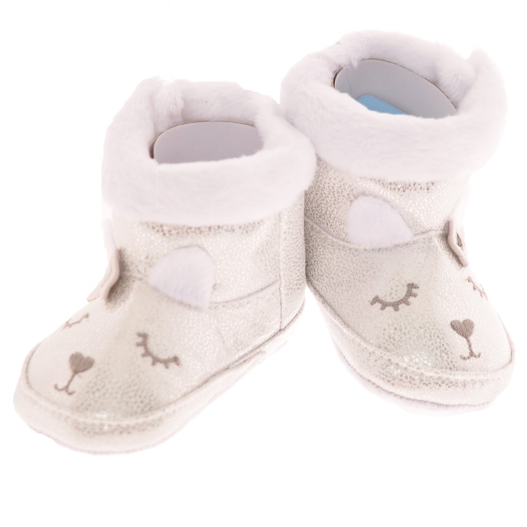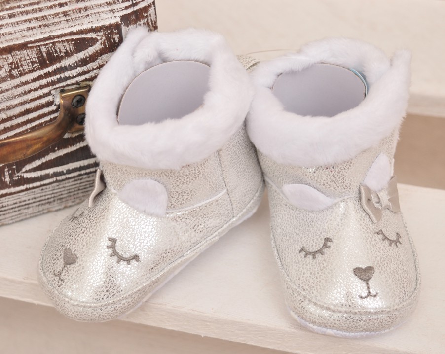 Zimowe buciki ocieplane dla dziewczynki zapinane na rzep. Uszyte z błyszczącej tkaniny w kolorze srebrnym i wykończone białym futerkiem. Dodatkową ozdobą tych błyszczących dziewczęcych bucików są wyszyta buzia króliczka oraz trójwymiarowe, białe, futerkowe uszka z doszytą srebrną kokardką na jednym uszku.