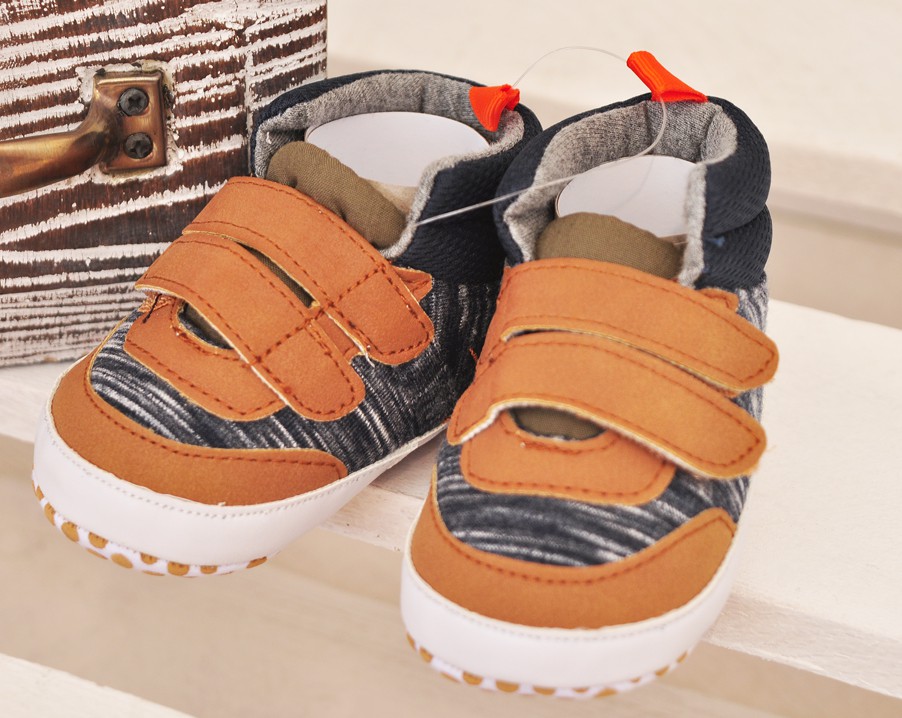 Buty niechodki dla chłopca, stylizowane na trampki zapinane na 2 rzepy. Wykonane z bawełny w kolorze granat melanż i wykończone materiałem w kolorze brązowym oraz białą podeszwą. Trampki chłopięce dostępne w 2 rozmiarach: 0-6M (z wkładką 10cm) oraz 6-12M (z wkładką 11cm).