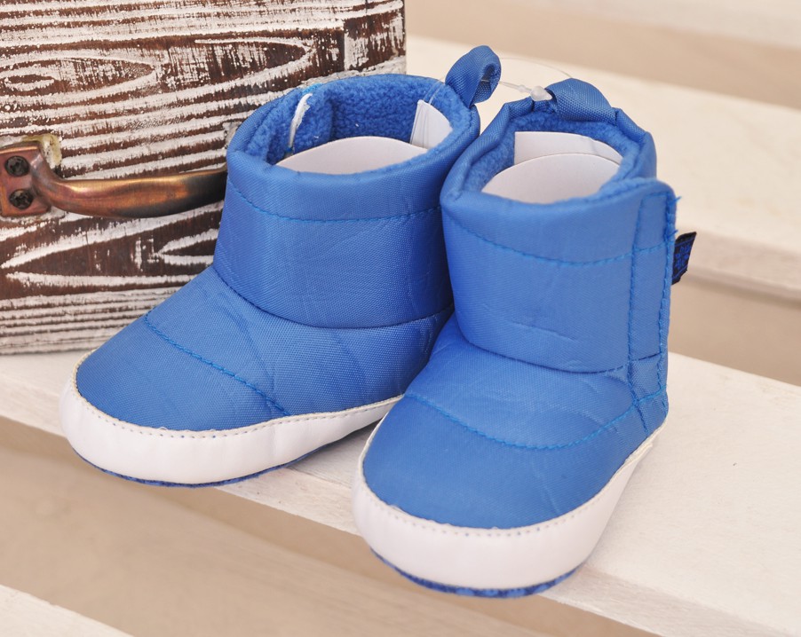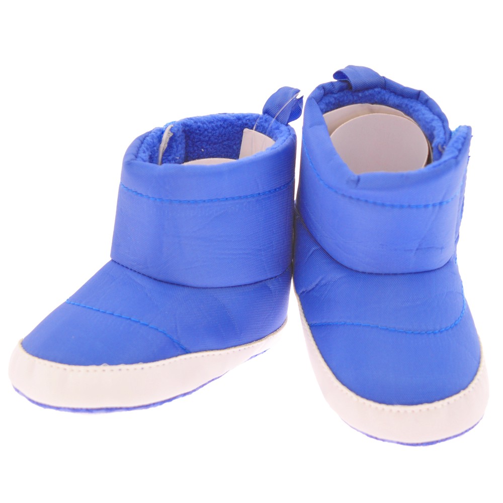 Ocieplane buty niechodki chłopięce w kolorze niebieskim stylizowane na śniegowce wykonane z nieprzemakalnej tkaniny. Buty od środka wykończone niebieskim polarem co zapewnia odpowiednią ochronę stópek maluszka w chłodniejsze dni. Buciki dostępne w 2 rozmiarach: 0-6M (z wkładką 10cm) oraz 6-12M (z wkładką 11cm).