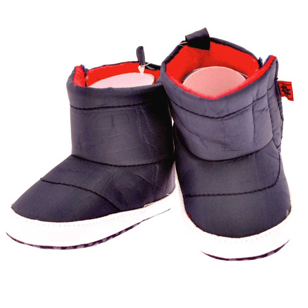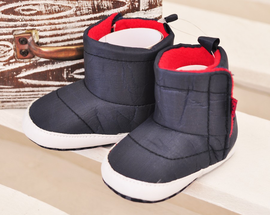 Ocieplane buty niechodki chłopięce w kolorze niebieskim stylizowane na śniegowce wykonane z nieprzemakalnej tkaniny. Buty od środka wykończone czerwonym polarem co zapewnia odpowiednią ochronę stópek maluszka w chłodniejsze dni. Buciki dostępne w 2 rozmiarach: 0-6M (z wkładką 10cm) oraz 6-12M (z wkładką 11cm).