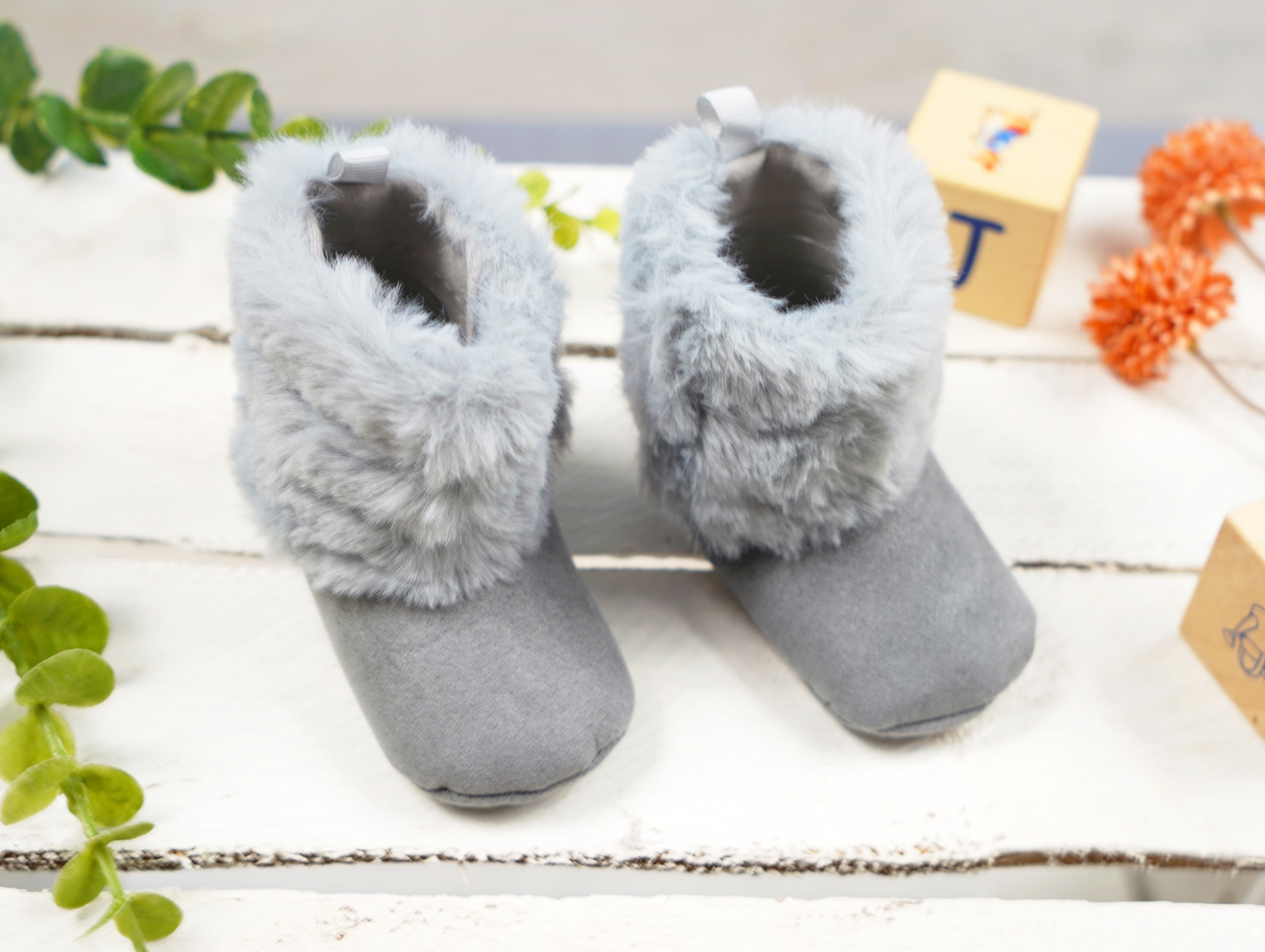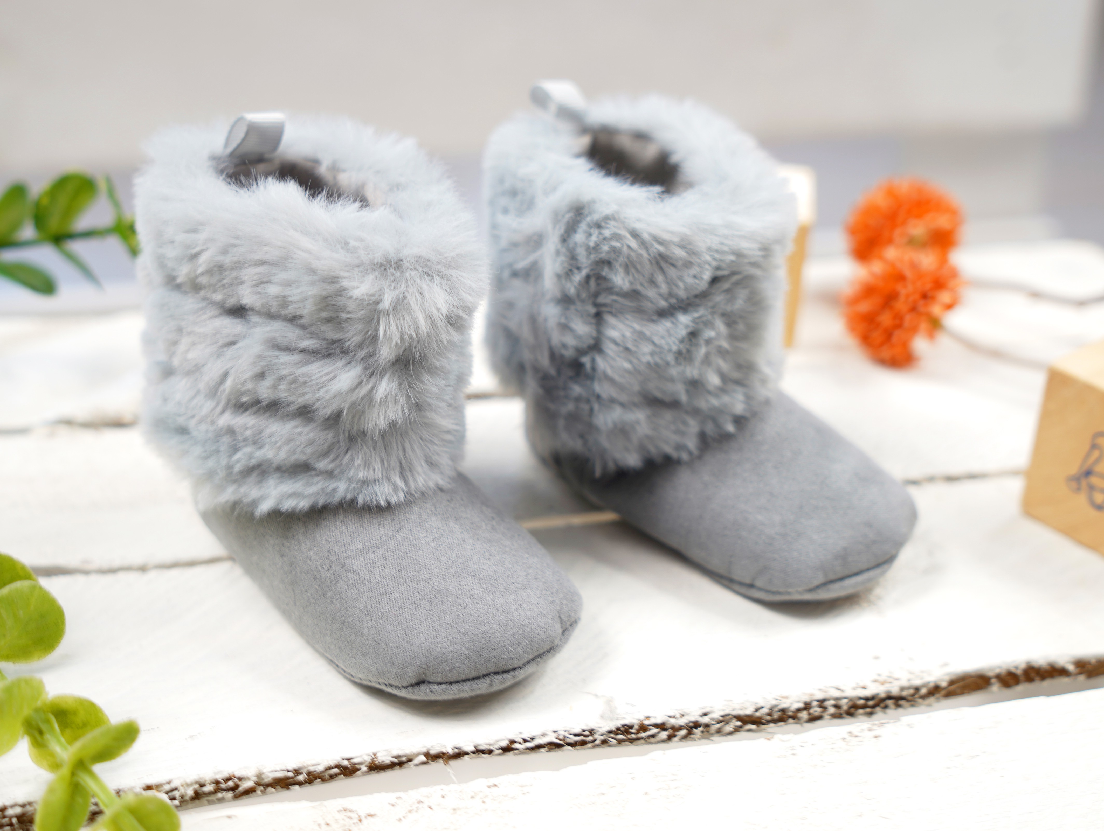 Niechodki dziewczęce, których niewątpliwą ozdobą jest futerko pokrywające górną część bucika. Wygodne niechodki zostały wykonane z szarego materiału oraz bawełnianego wnętrza. Budowa tych niemowlęcych bucików sprawia, że zapewniają odpowiednią termoregulacje stópek maluszka. Buciki dostępne w 2 rozmiarach: 0-6M (z wkładką 10cm) oraz 6-12M (z wkładką 11cm). Buciki zapinane na boczne rzepy.
