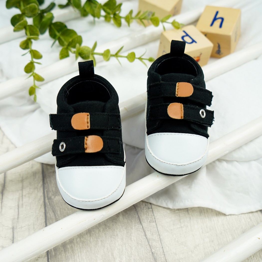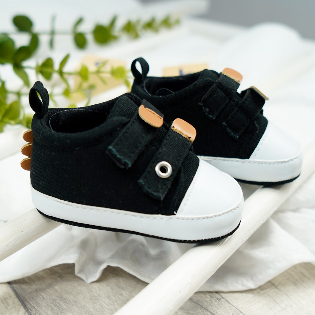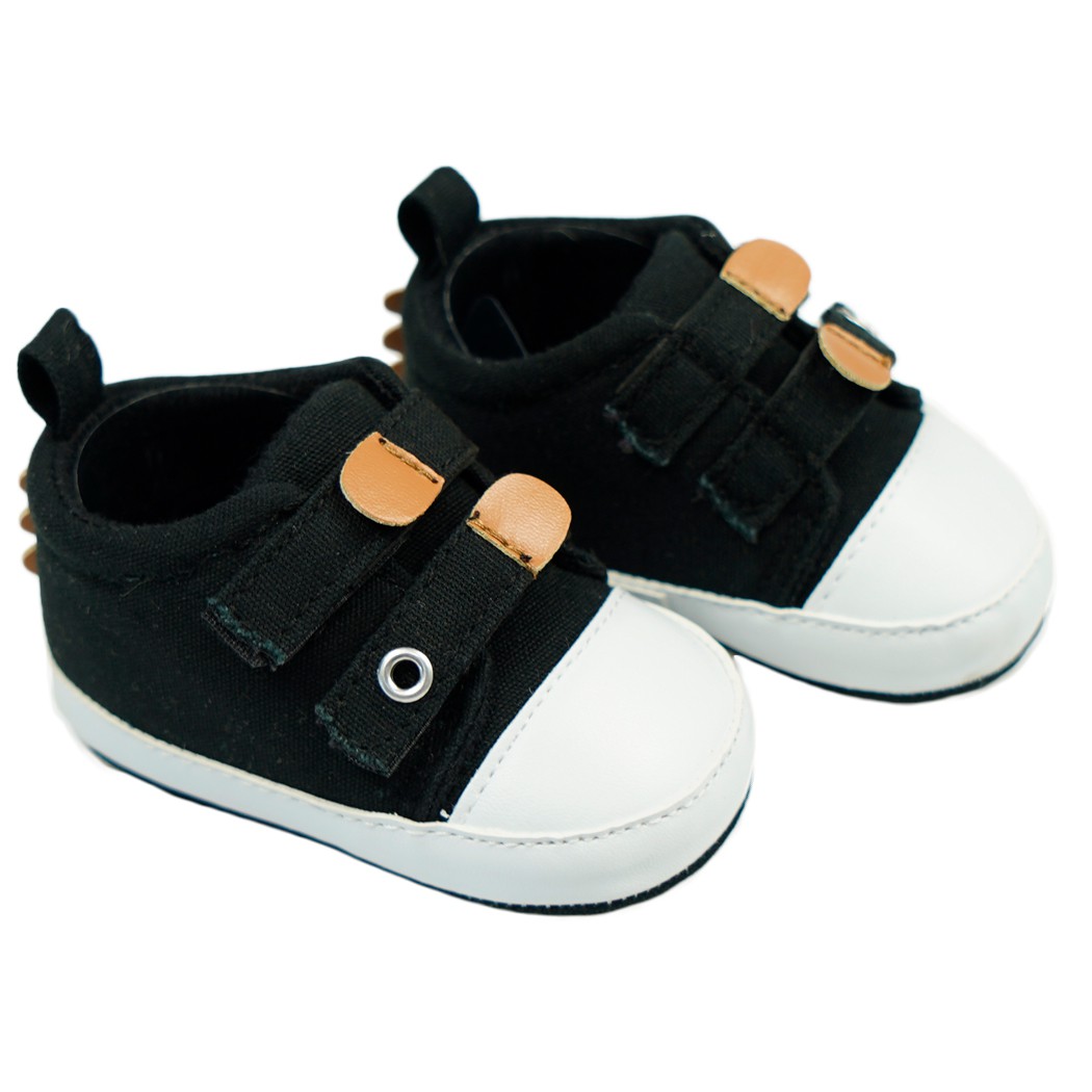 Przedstawiamy trampki niemowlęce w kolorze czarnym z brązowymi elementami, zapinane na rzep, które przypadną do gustu każdemu maluszkowi. Nasz produkt został wyprodukowany przez polskiego producenta, co gwarantuje najwyższą jakość wykonania.