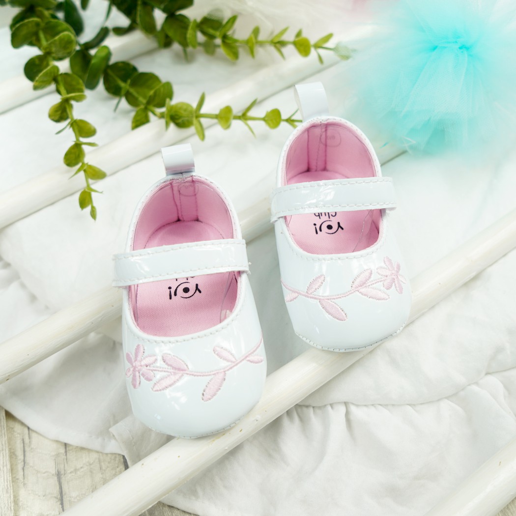 Buty niechodki dziewczęce sprawdzą się doskonale na chrzest - białe z ozdobnym połyskiem oraz haftowanym różowym kwiatkiem. Wnętrze bucików zostało wykonane z miękkiej i przyjemnej w dotyku bawełny, co zapewnia komfort dla małych stópek. Baletki posiadają też paseczek zapinany na rzep, który ułatwia noszenie bucików. Buciki dostępne w 2 rozmiarach: 0-6M (10cm wkładka) oraz 6-12M (11cm wkładka).