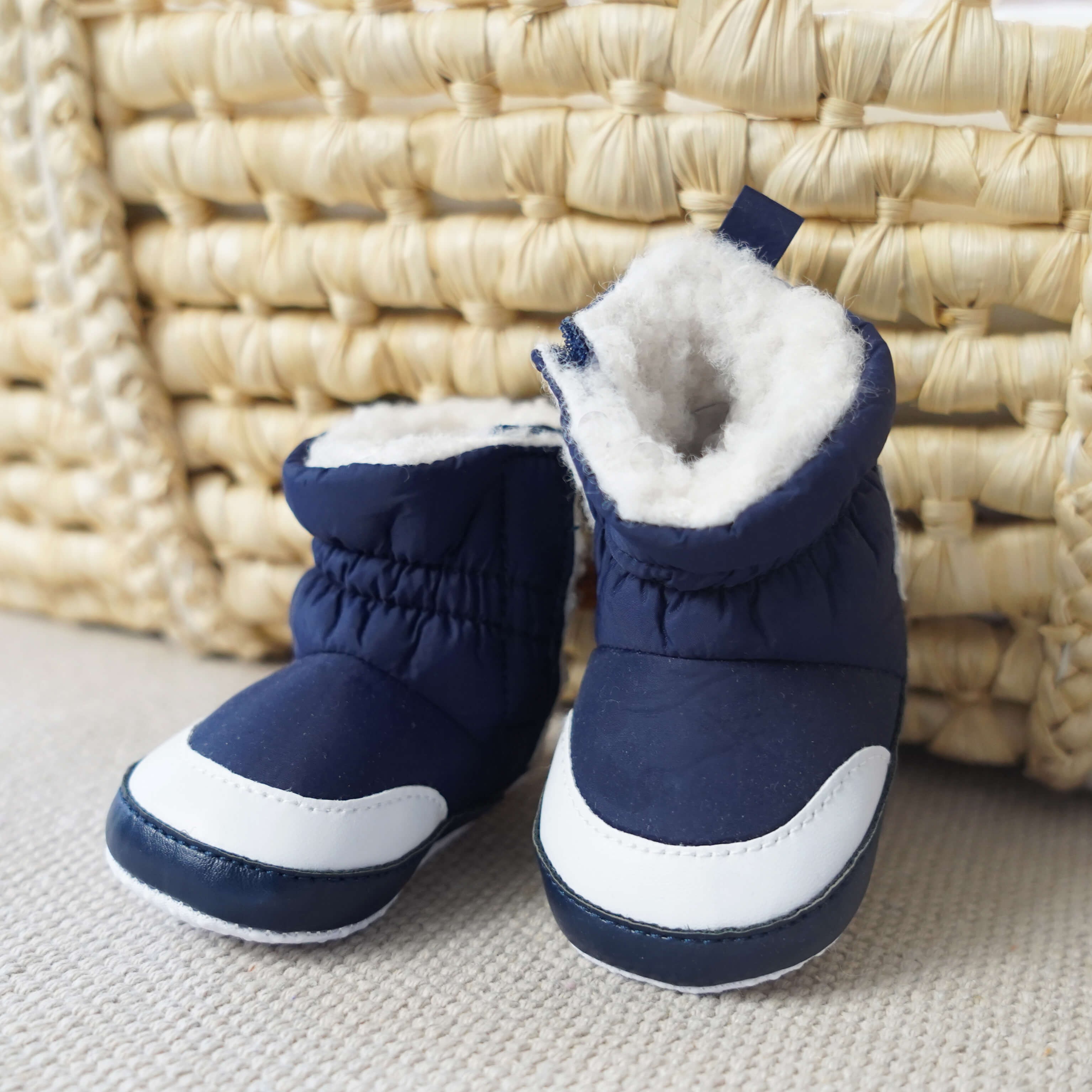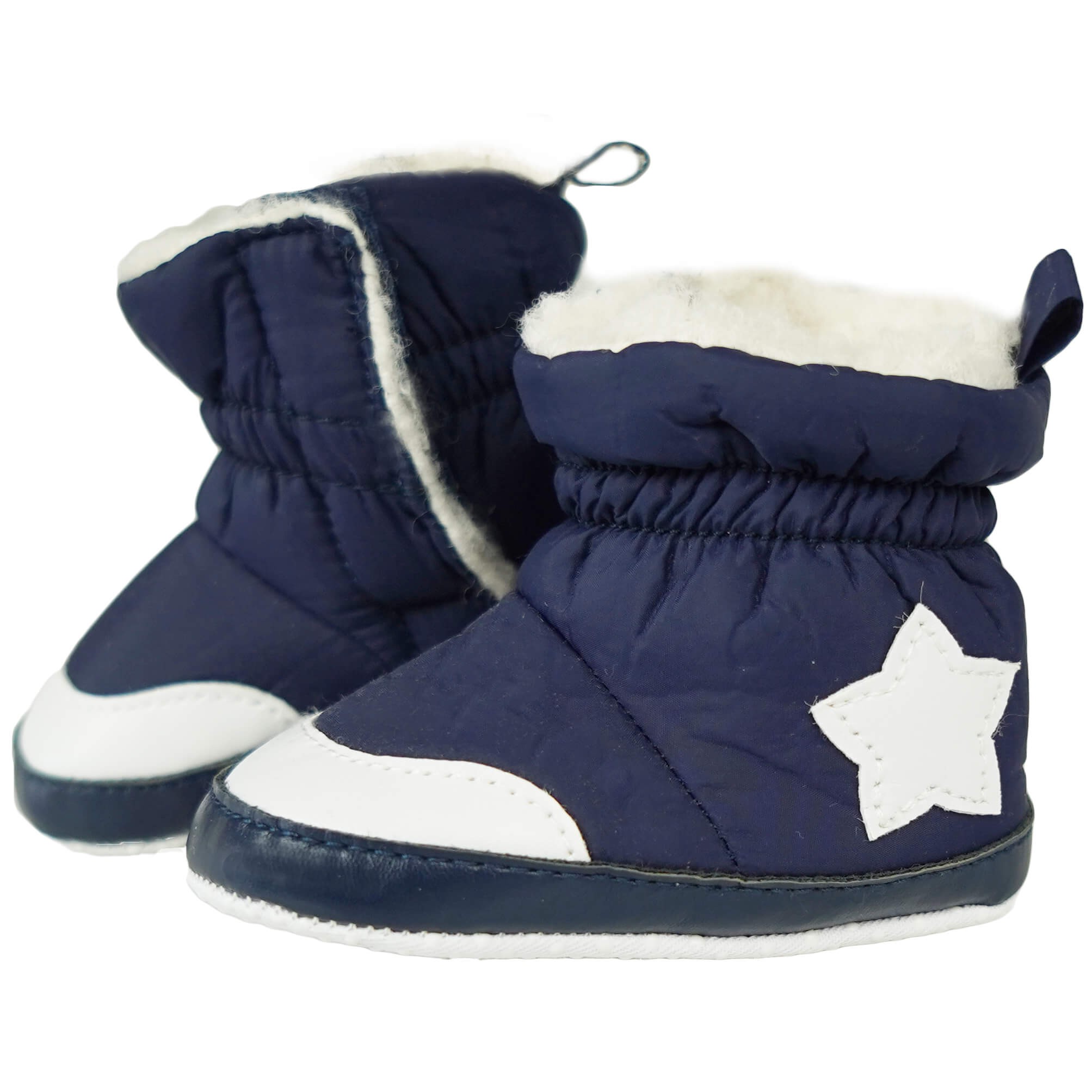 Ocieplane buty niechodki w kolorze granatowym z ozdobnymi elementami w kolorze białym, stylizowane na śniegowce. Buciki wykonane z nieprzemakalnej tkaniny. Buty od środka wykończone białym futerkiem co zapewnia odpowiednią ochronę stópek maluszka w chłodniejsze dni. Te urocze niechodki z gwiazdką pokochają rodzice zarówno dziewczynek jak i chłopców.
