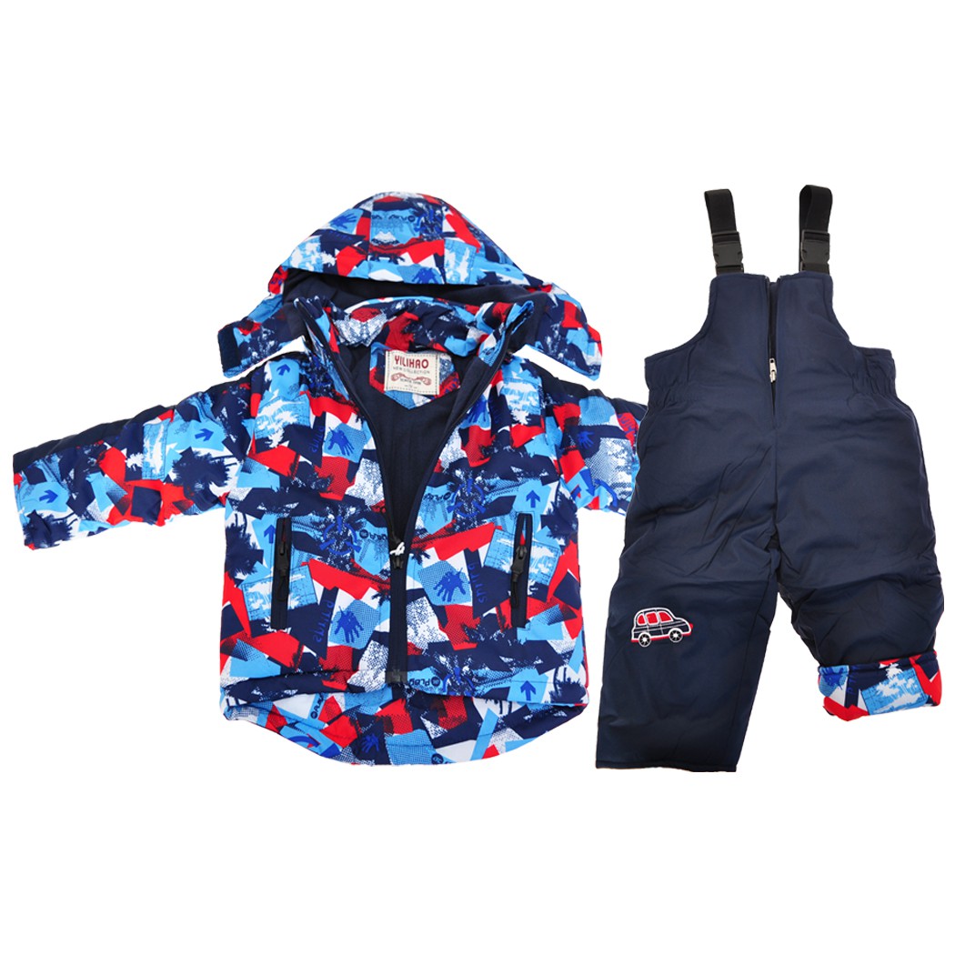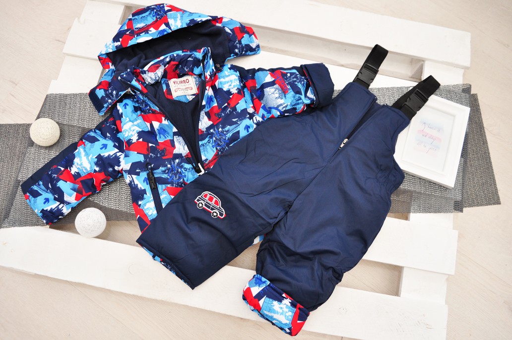Kombinezon zimowy dla chłopca, w skład którego wchodzą: zapinana na suwak ciepła kurtka zimowa w biało, granatowo, czerwono, niebieskie geometryczne wzory oraz granatowe spodnie typu narciarskiego.