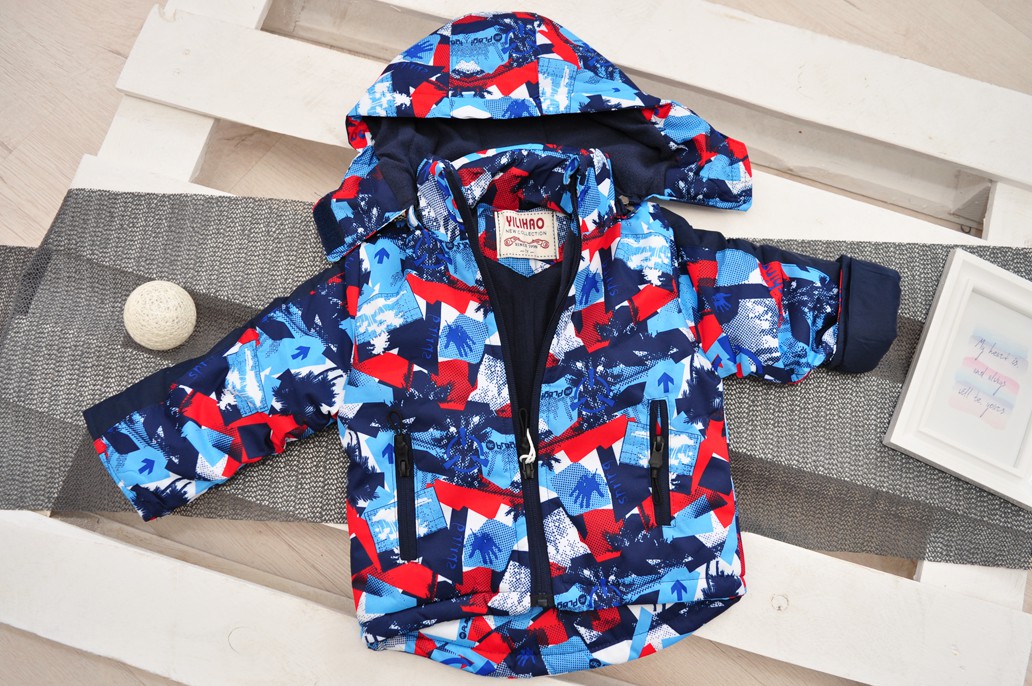 Dostępna w zestawie kurtka zimowa wykonana z warstwy nieprzemakalnej od strony zewnętrznej oraz ocieplona od wewnątrz miękkim granatowym polarem. Posiada ona stójkę osłaniającą szyję dziecka oraz odsuwany kaptur wyposażony w zapięcie na rzep. Rękawy kurtki z możliwością wywinięcia również zostały ocieplone polarem. Dwie wbudowane kieszenie.