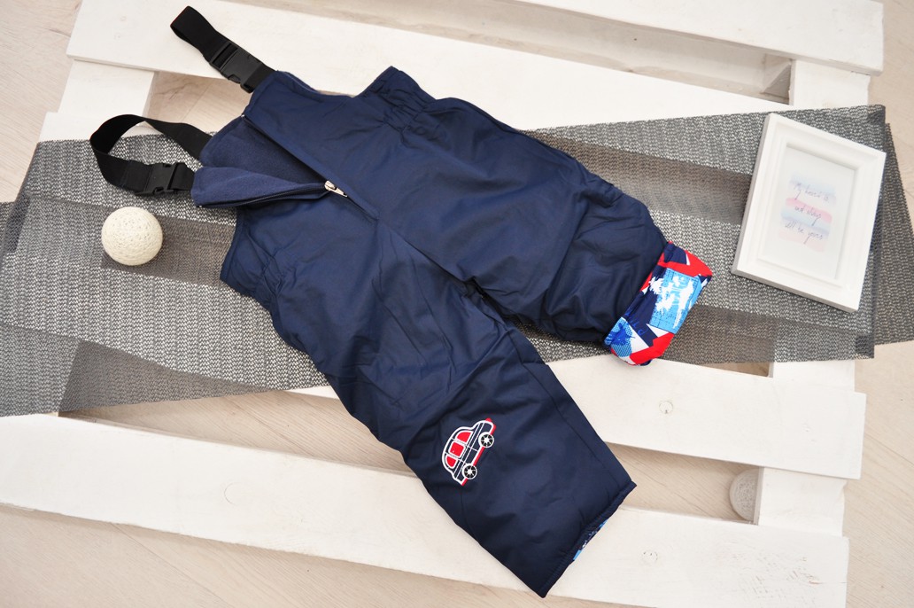 W skład kompletu wchodzą również nieprzemakalne spodnie typu narciarskiego obszyte od wewnątrz miękkim granatowym polarem. Spodnie posiadają suwak z przodu , elastyczną gumkę po bokach na wysokości pasa oraz regulowane szelki zapinane na plastikowe klamry. Dół nogawek spodni został dodatkowo od środka obszyty tkaniną w kolorze kurtki tak aby można było w ramach potrzeby wywinąć ozdobne mankiety przy nogawkach.