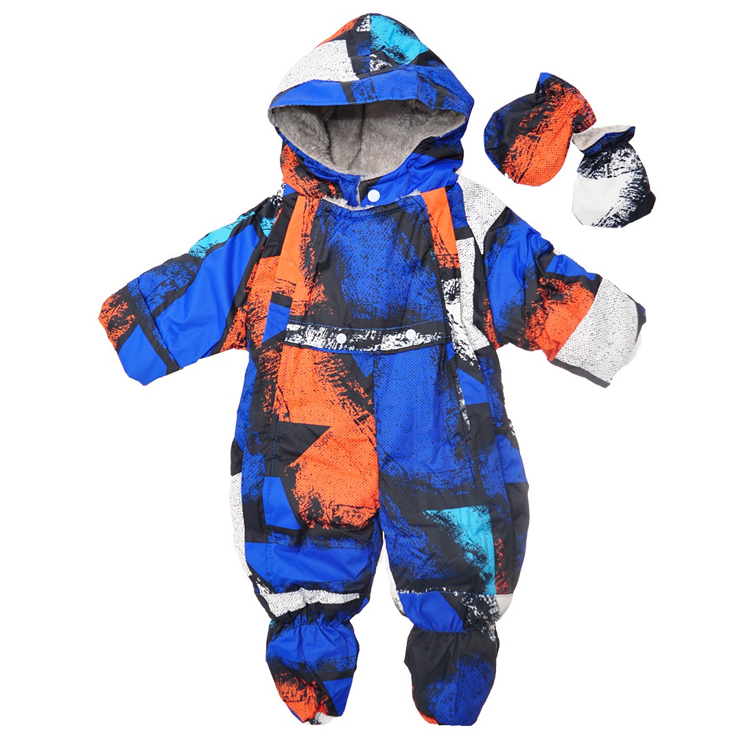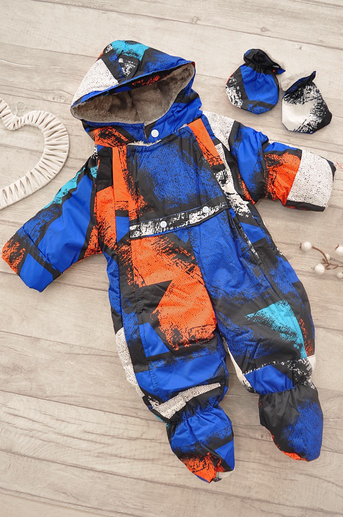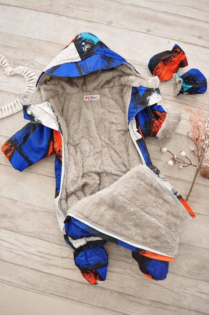 Zimowy kombinezon nieprzemakalny na futerku. Zasuwany przez całą długość na 2 suwaki. Kombinezon z warstwy nieprzemakalnej od strony zewnętrznej, ocieplony od wewnątrz na całej długości (łącznie ze stópkami) miękkim szarym futerkiem. Kaptur z daszkiem obszyty od wewnątrz futerkiem osłoni głowę dziecka przed zimnymi podmuchami wiatru. Na wysokości szyi specjalna zakładka zapinana na zatrzaski chroniąca dodatkowo szyję dziecka przed zawianiem. Kombinezon dziecięcy wyposażony dodatkowo w nieprzemakalne rękawiczki na futerku.