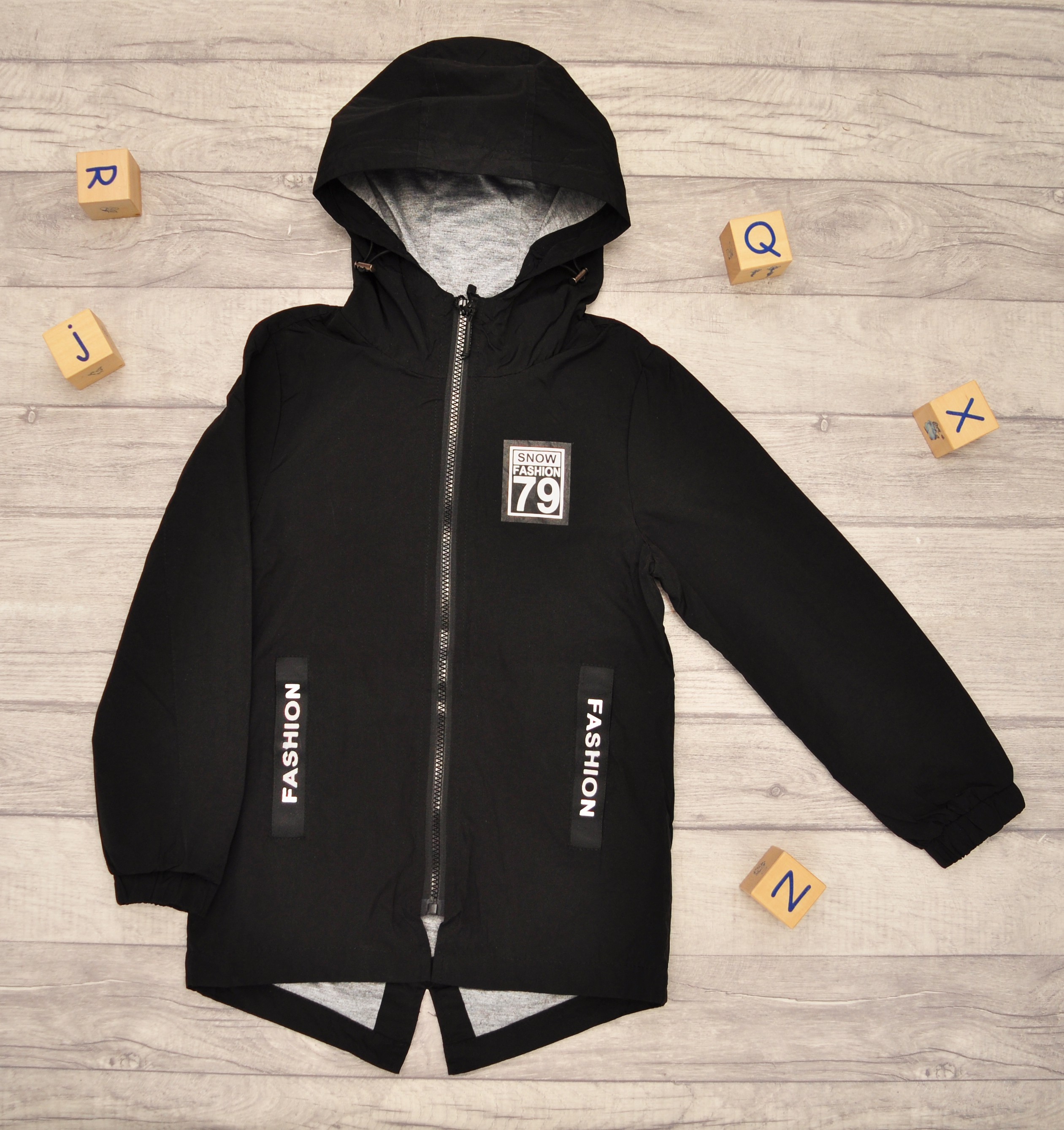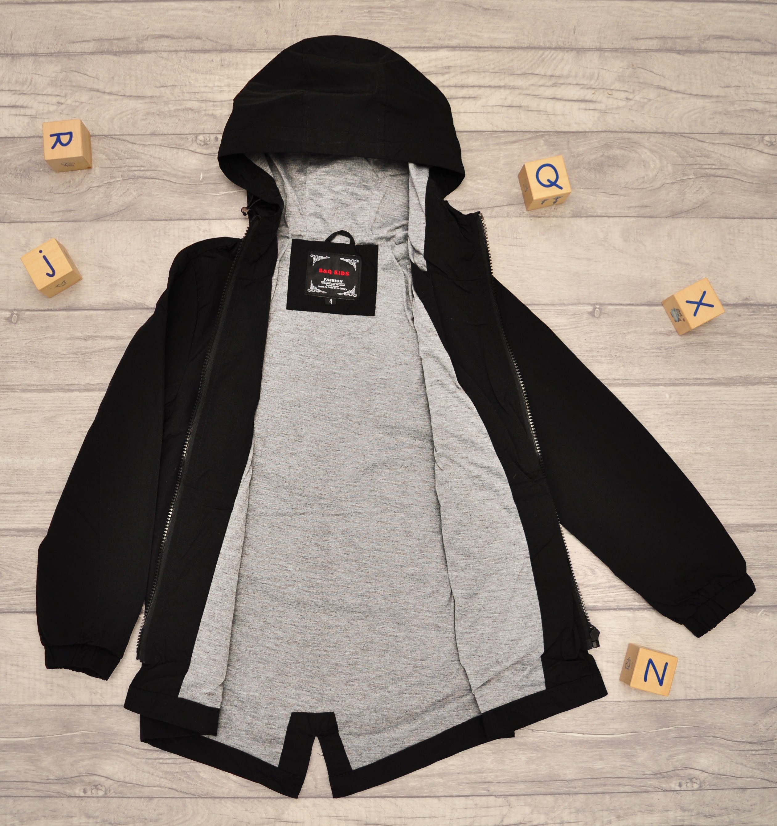 Wiatrówka z kapturem zapinana na suwak. Posiada dwie zapinane na zatrzask, wpuszczane kieszenie przykryte ozdobnymi patkami. Zewnętrzna warstwa kurtki jest czarna i nieprzemakalna a od wewnątrz posiada szarą podszewkę. Dół kurtki został z tyłu lekko przedłużony, rękawy wykończone gumką. Kaptur posiada dwa wygodne ściągacze.