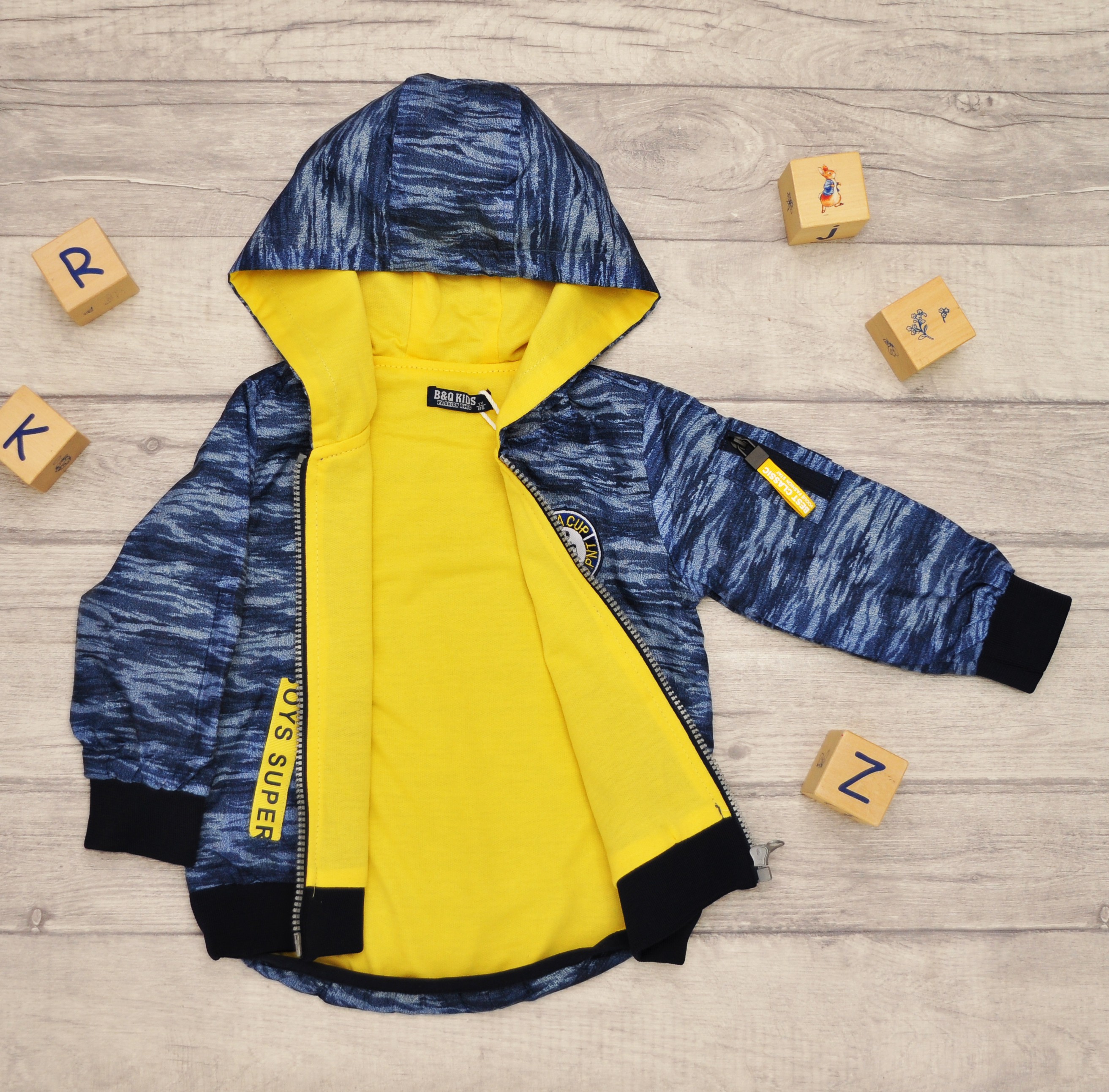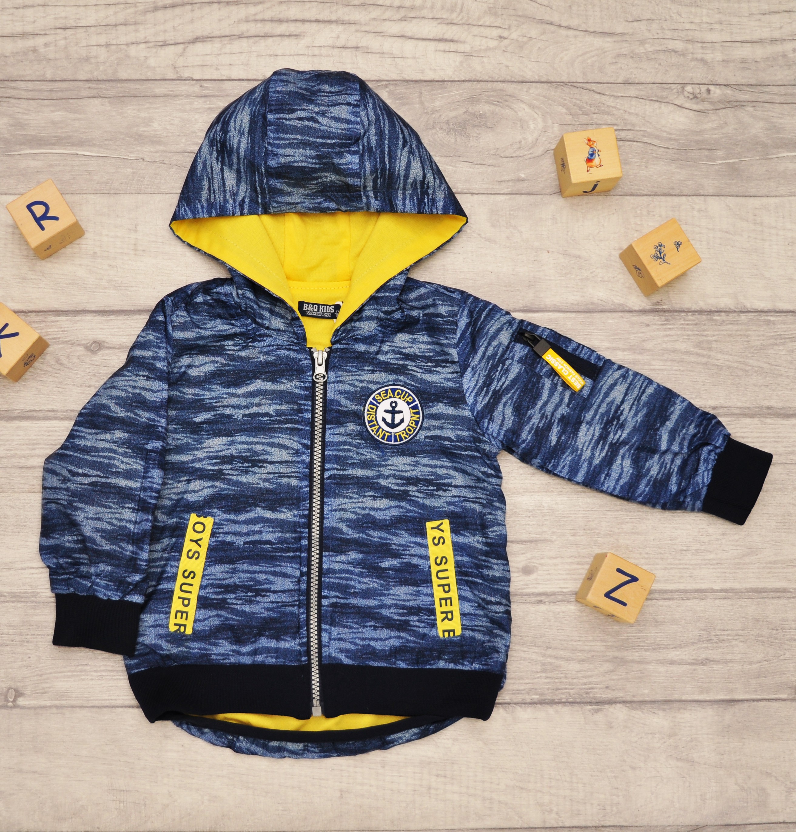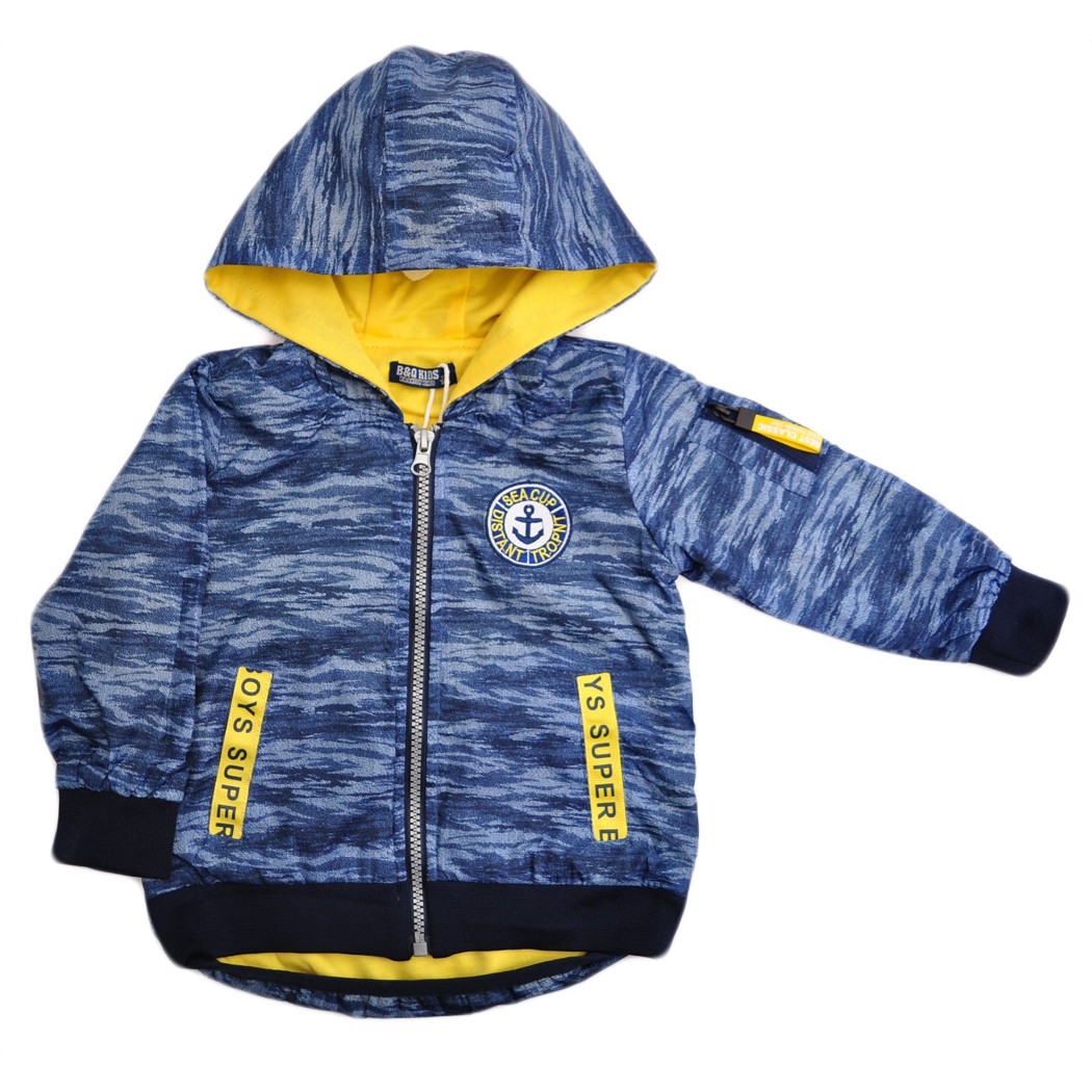 Elementem ozdobnym wiatrówki jest aplikacja z napisem w kolorze żółtym. Jej krój umożliwia całkowite rozpięcie, a ubranko jest funkcjonalne i wygodne. Idealne jako okrycie wierzchnie na wiosnę, jesień lub chłodniejsze letnie dni.