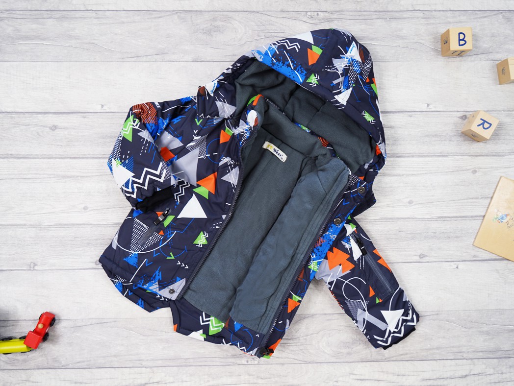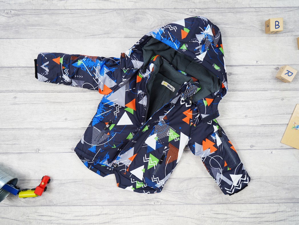 Dostępna w zestawie kurtka zimowa wykonana z warstwy nieprzemakalnej od strony zewnętrznej oraz ocieplona od wewnątrz miękkim szarym polarem. Posiada ona stójkę osłaniającą szyję dziecka oraz odsuwany kaptur wyposażony w zapięcie na rzep. Kaptur kurtki również został ocieplony polarem. Dwie wbudowane kieszenie na suwak oraz zasuwana kieszeń na ramieniu. Rękawy nieocieplone polarem, wykończone doszytym wewnątrz ściągaczem.