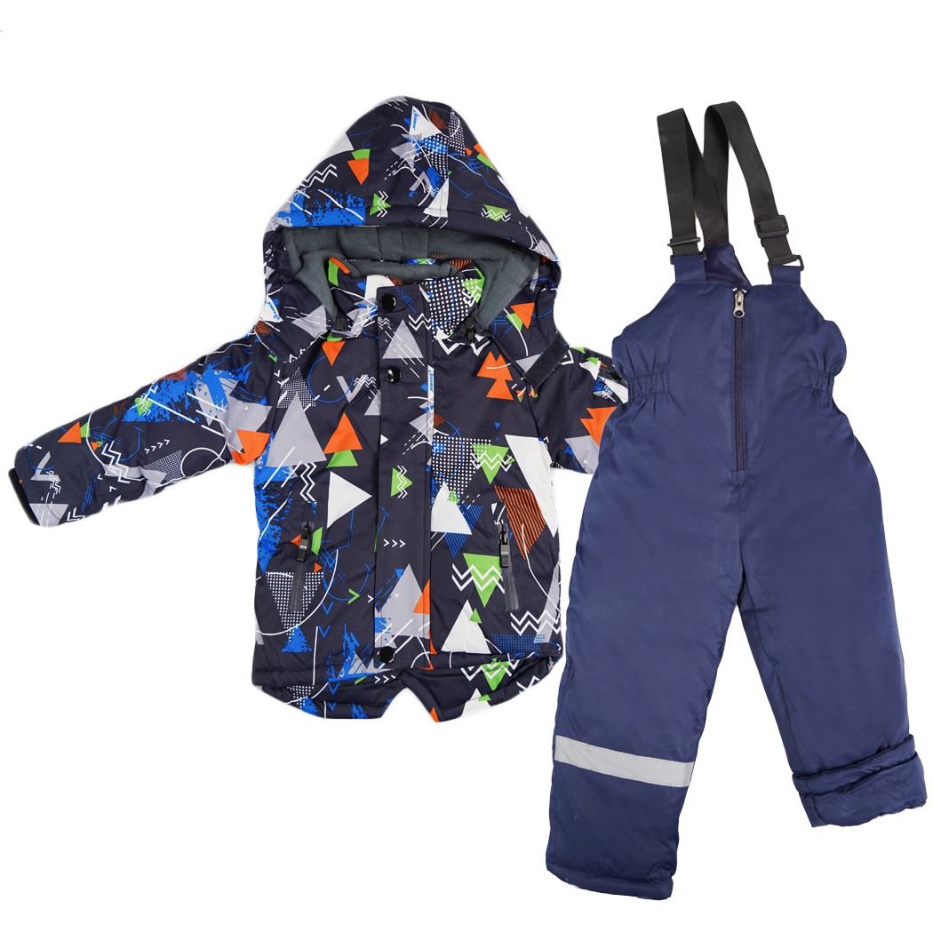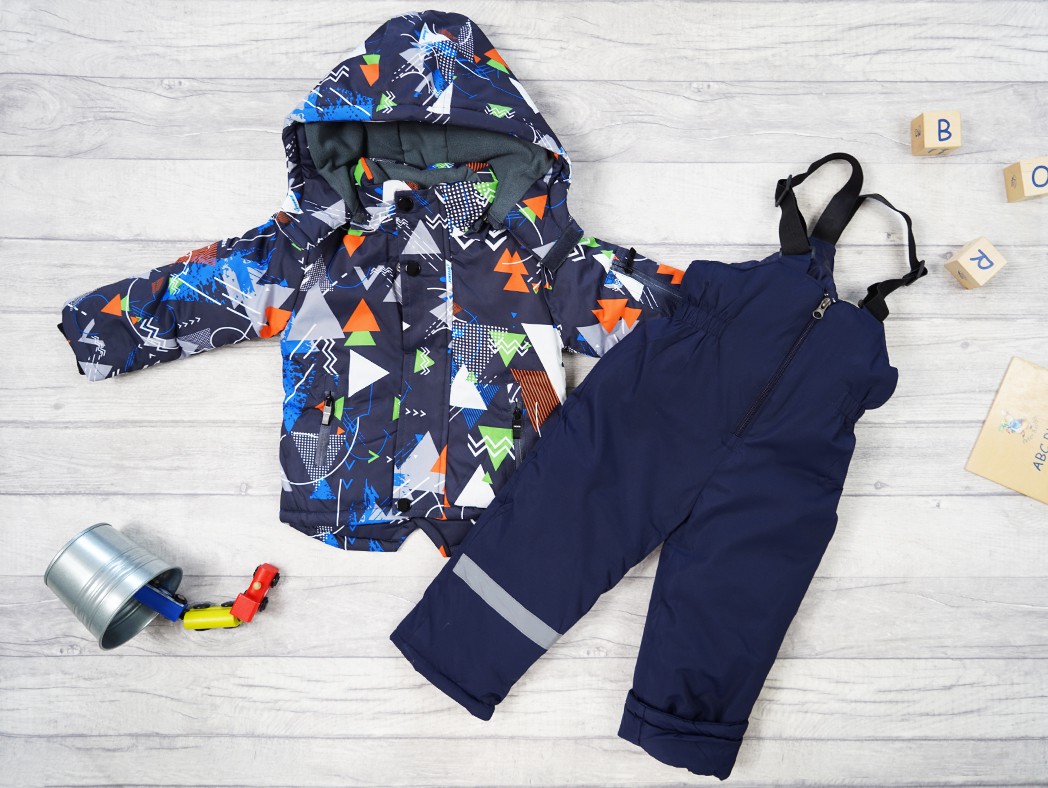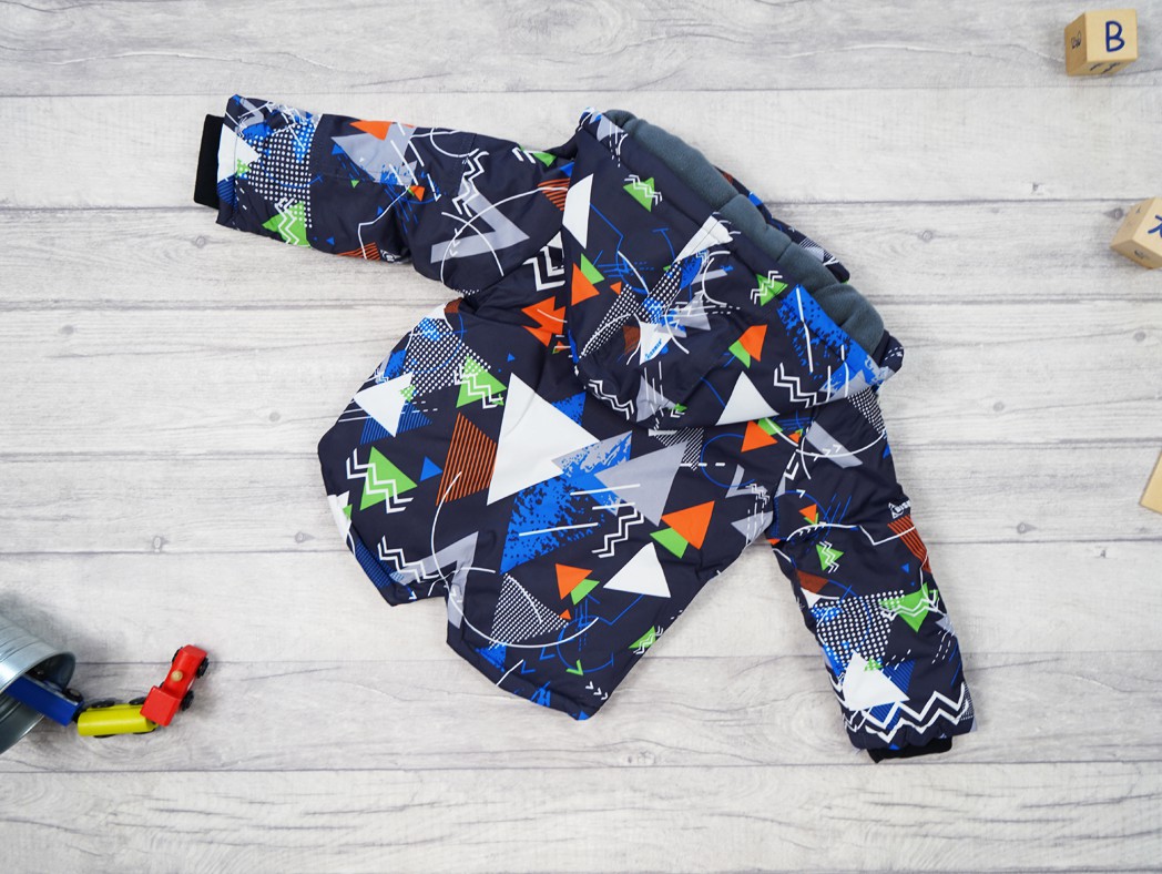 Kombinezon zimowy dla dziecka, w skład którego wchodzą: zapinana na suwak i guziki ciepła, grafitowa kurtka zimowa w geometryczne wzory oraz granatowe spodnie typu narciarskiego.