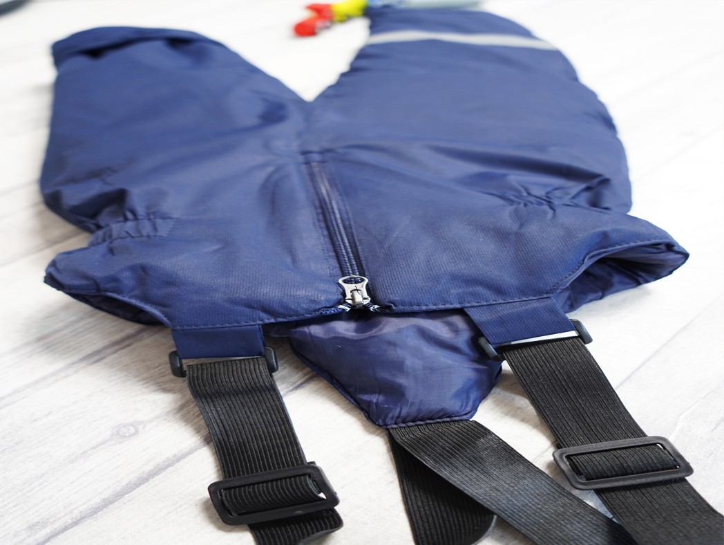 W skład kompletu wchodzą również nieprzemakalne spodnie typu narciarskiego. Spodnie posiadają suwak z przodu , elastyczną gumkę po bokach na wysokości pasa oraz regulowane szelki. Dół nogawek spodni został dodatkowo od środka obszyty nieprzemakalną tkaniną tak aby można było w ramach potrzeby wywinąć mankiety przy nogawkach.