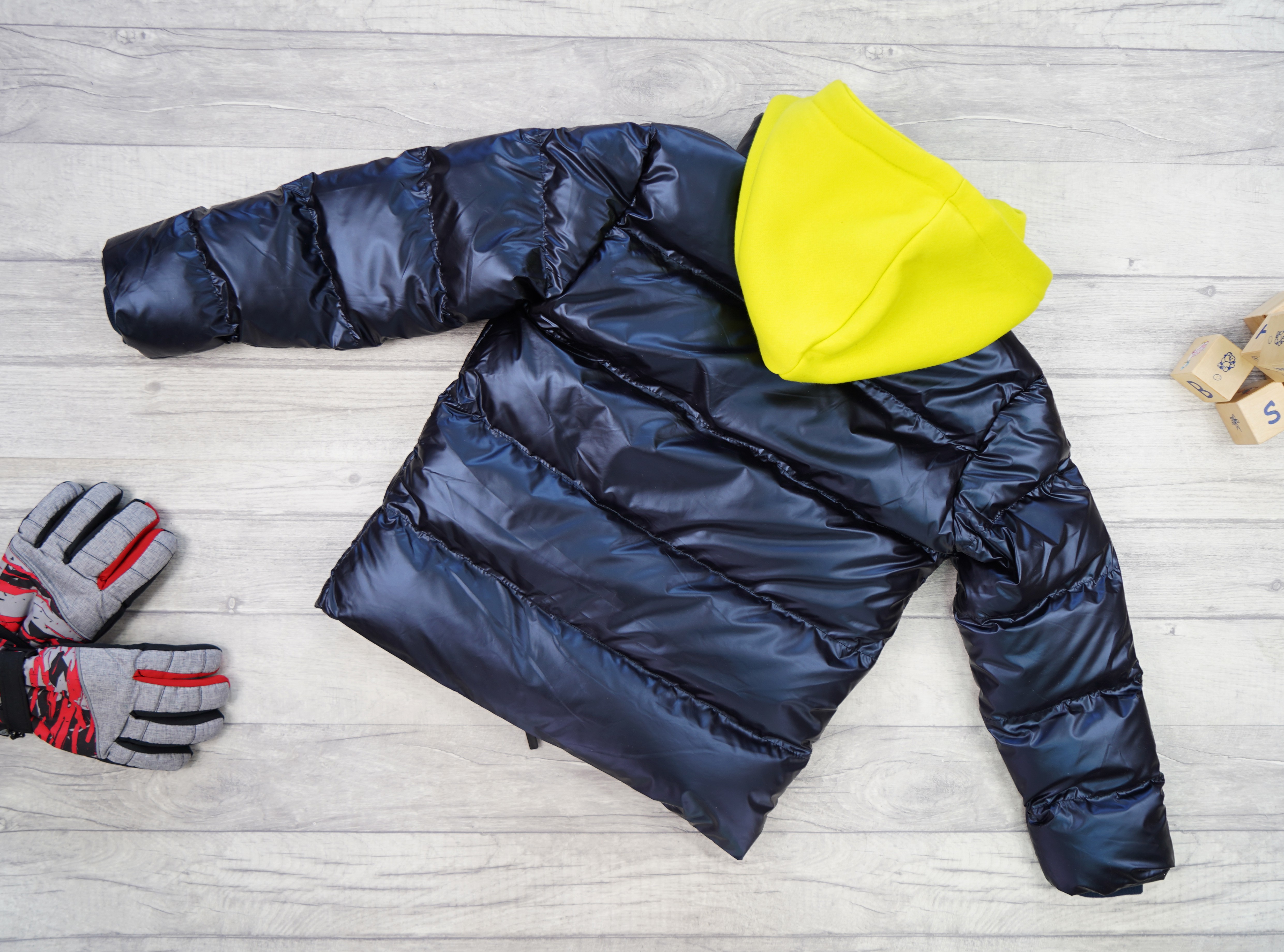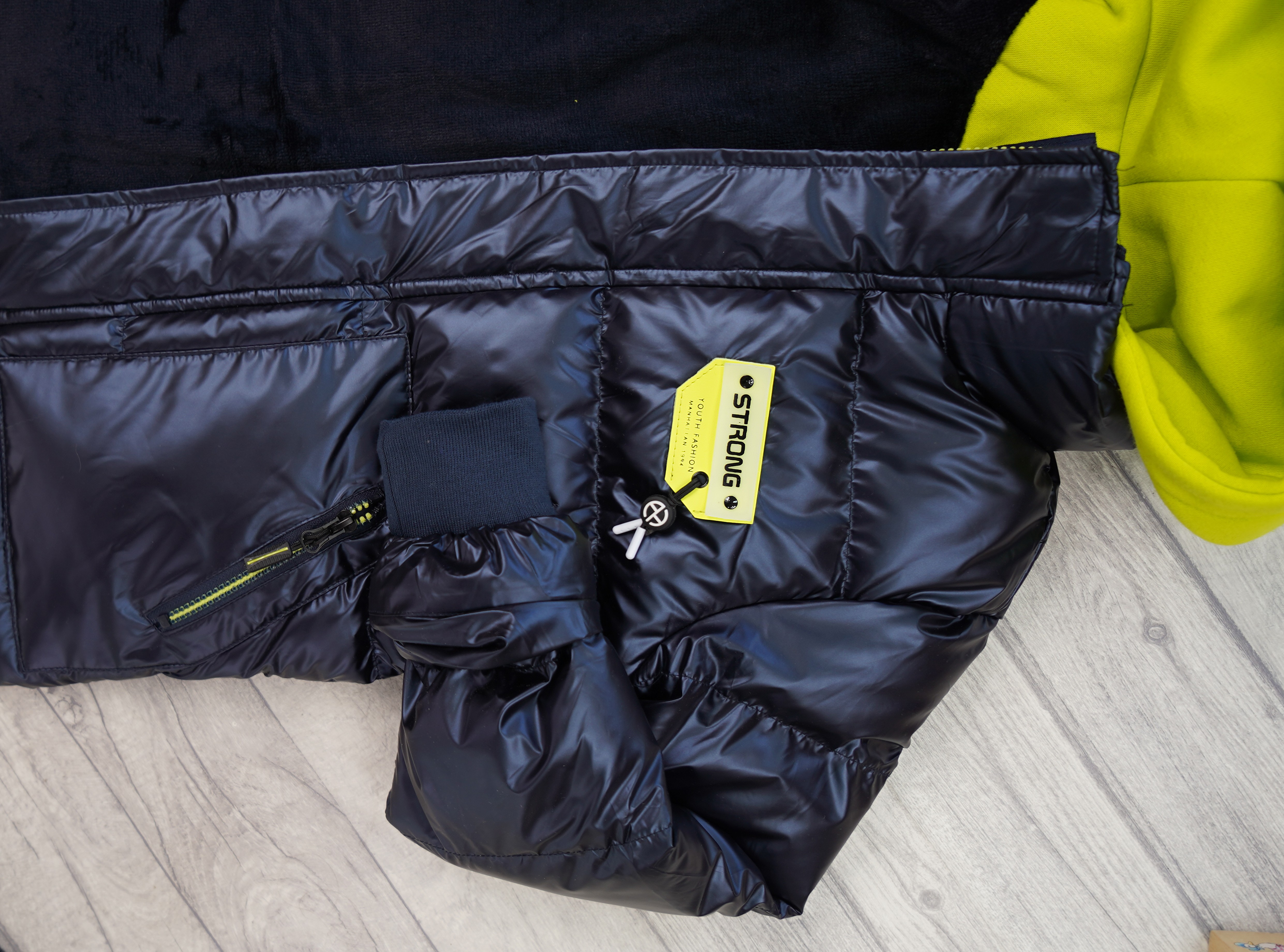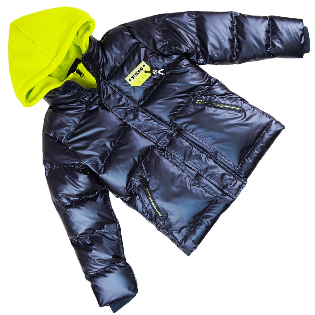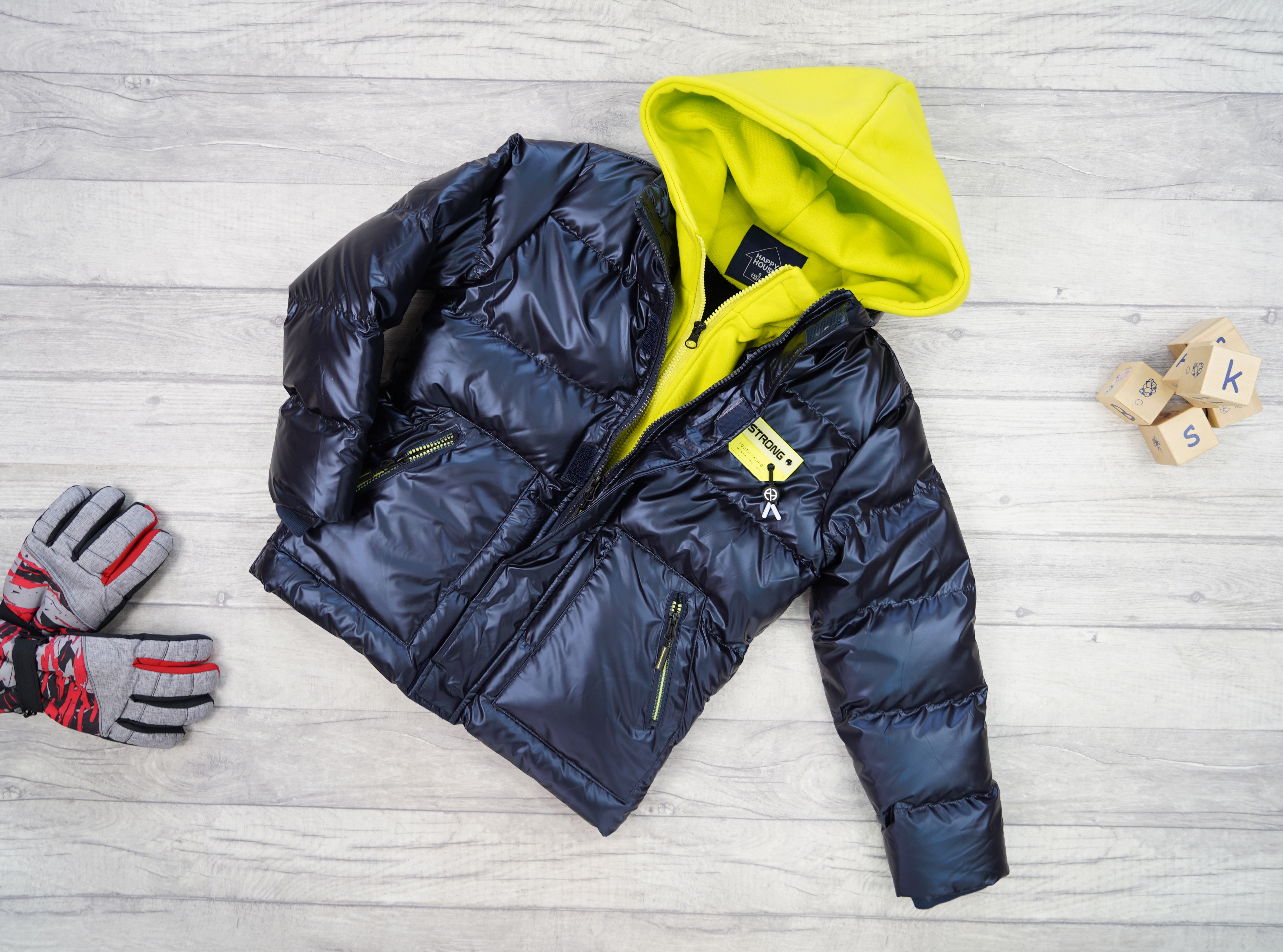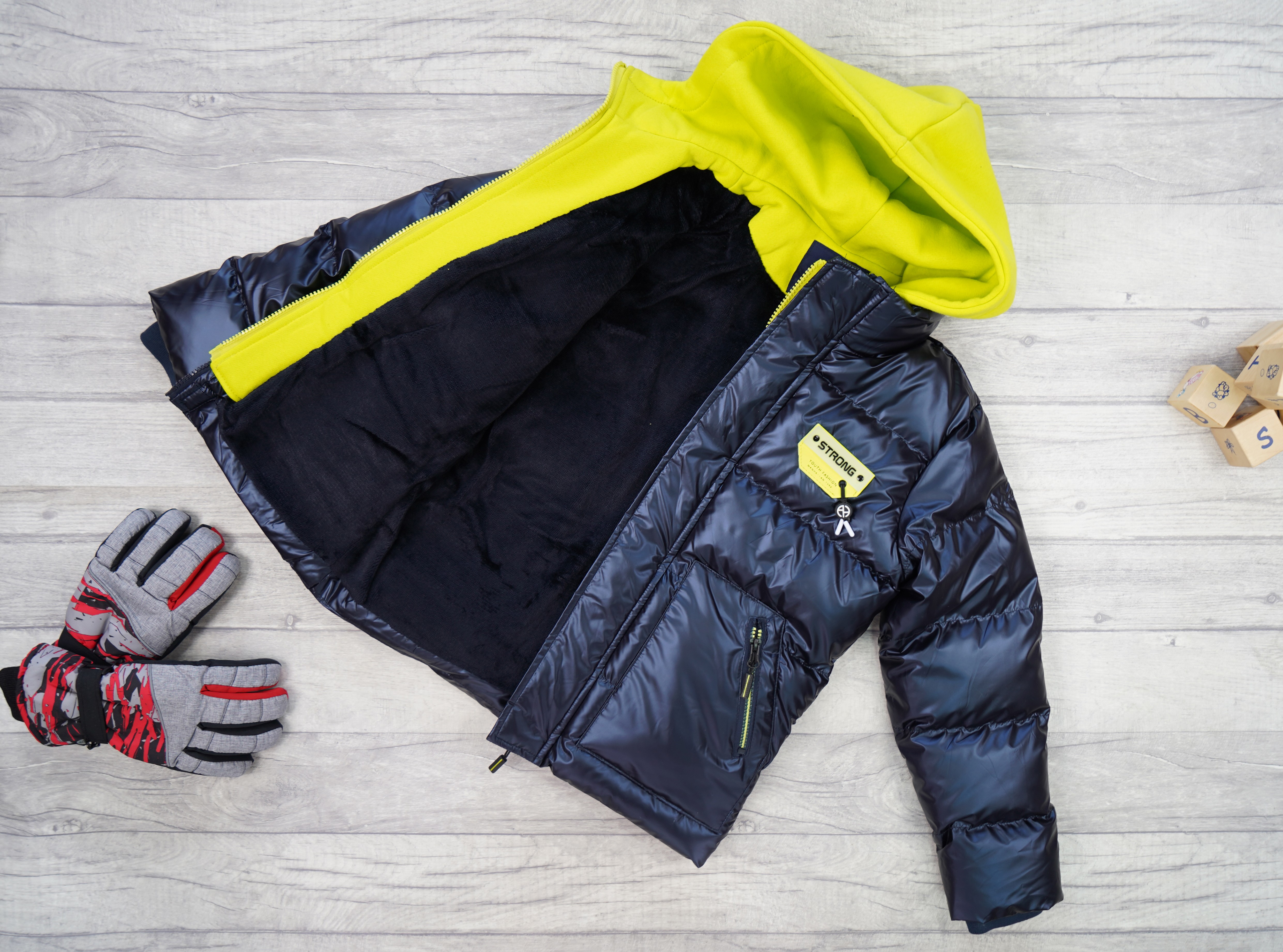 Ocieplana kurtka chłopięca w kolorze granatowy metalik podszyta od wewnątrz miękkim futerkiem. Doszyty kaptur kurtki z podwójnej bawełny dresowej w kolorze żółtym neonowym przechodzi w wewnętrzny suwak. Podwójne zapięcie na suwak, po bokach kieszenie również zapinane na suwaki. Rękawy kurtki bez futerkowej podszewki, wykończone granatowym ściągaczem chroniącym przed zimnym powietrzem.
