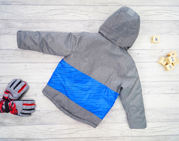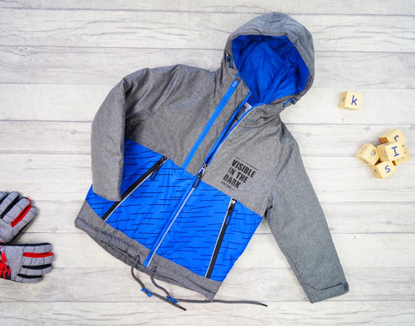 Zimowa kurtka ocieplana w kolorze szarym z niebieskimi wstawkami.