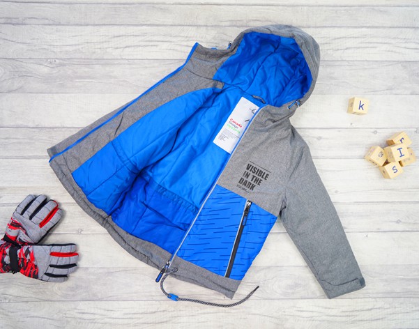 Ocieplana kurtka dziecięca w kolorze szarym na miłej, intensywnej niebieskiej podszewce. Ta zimowa kurtka posiada kaptur ze ściągaczami i ozdobny, czarny napis po lewej stronie. Zapięcie na suwak, po bokach kieszenie również zamykane na suwak. Rękawy kurtki wykończone są ściągaczem na rzep. Kurtka dla chłopca posiada niebieski pas ozdobny wzdłuż kurtki oraz dodatkową atrapę suwaka równoległą do właściwego. Kurtka ocieplana przedłużona z tyłu z dwoma ściągającymi, ozdobnymi sznurkami na samym dole.