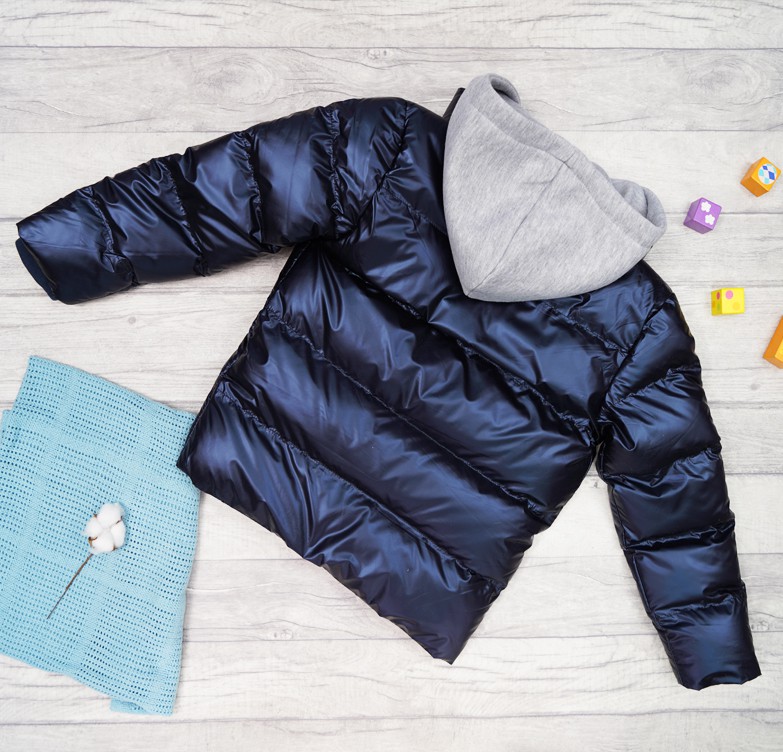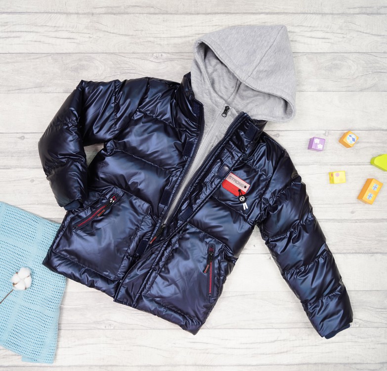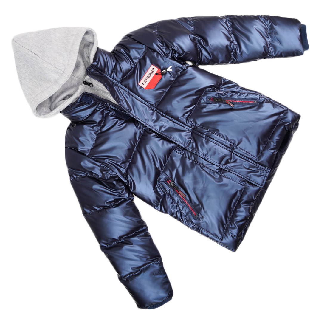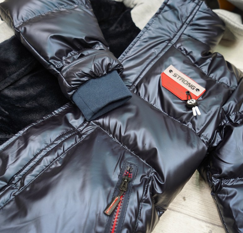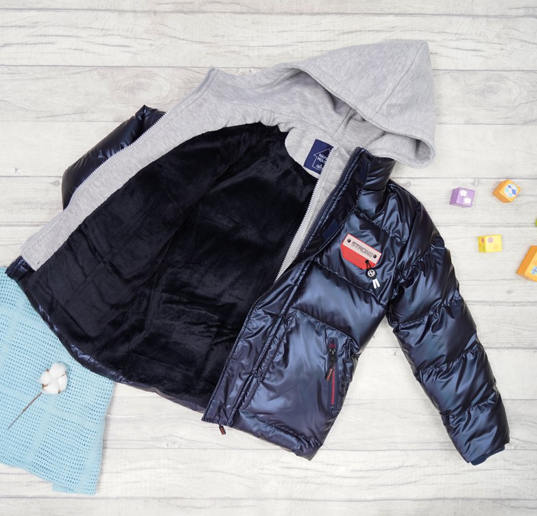 Ocieplana kurtka chłopięca w kolorze granatowy metalik podszyta od wewnątrz miękkim futerkiem. Doszyty kaptur kurtki z podwójnej bawełny dresowej w kolorze szarym przechodzi w wewnętrzny suwak. Podwójne zapięcie na suwak, po bokach kieszenie również zapinane na suwaki. Rękawy kurtki bez futerkowej podszewki, wykończone granatowym ściągaczem chroniącym przed zimnym powietrzem.